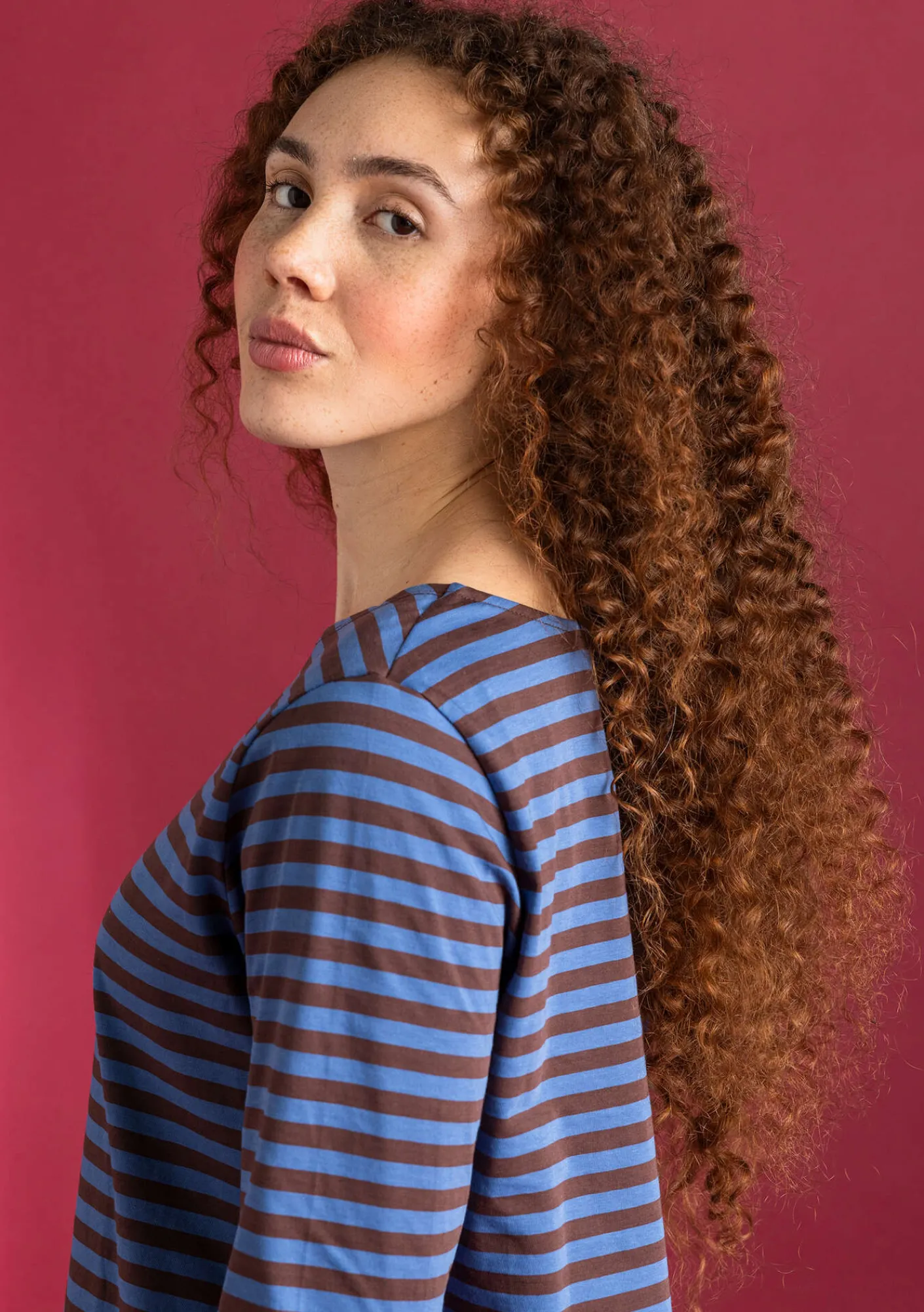 En garnfärgad rand, i enkel modell med hellång ärm. Lätt båtformad halsringning med en enkel tvånåls-stickning runt om.