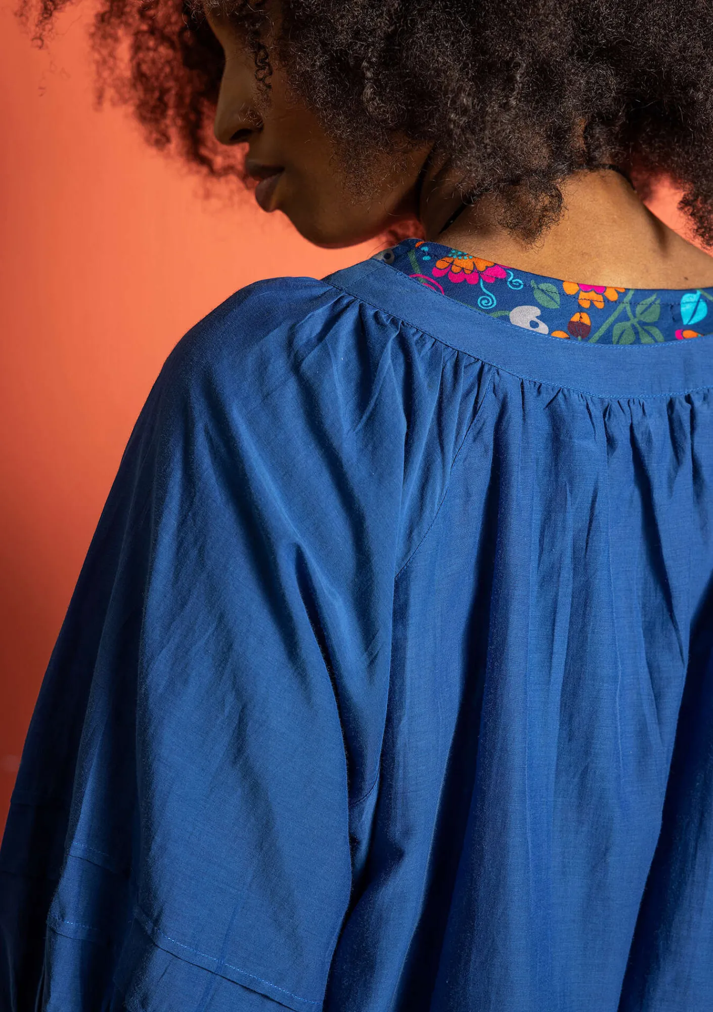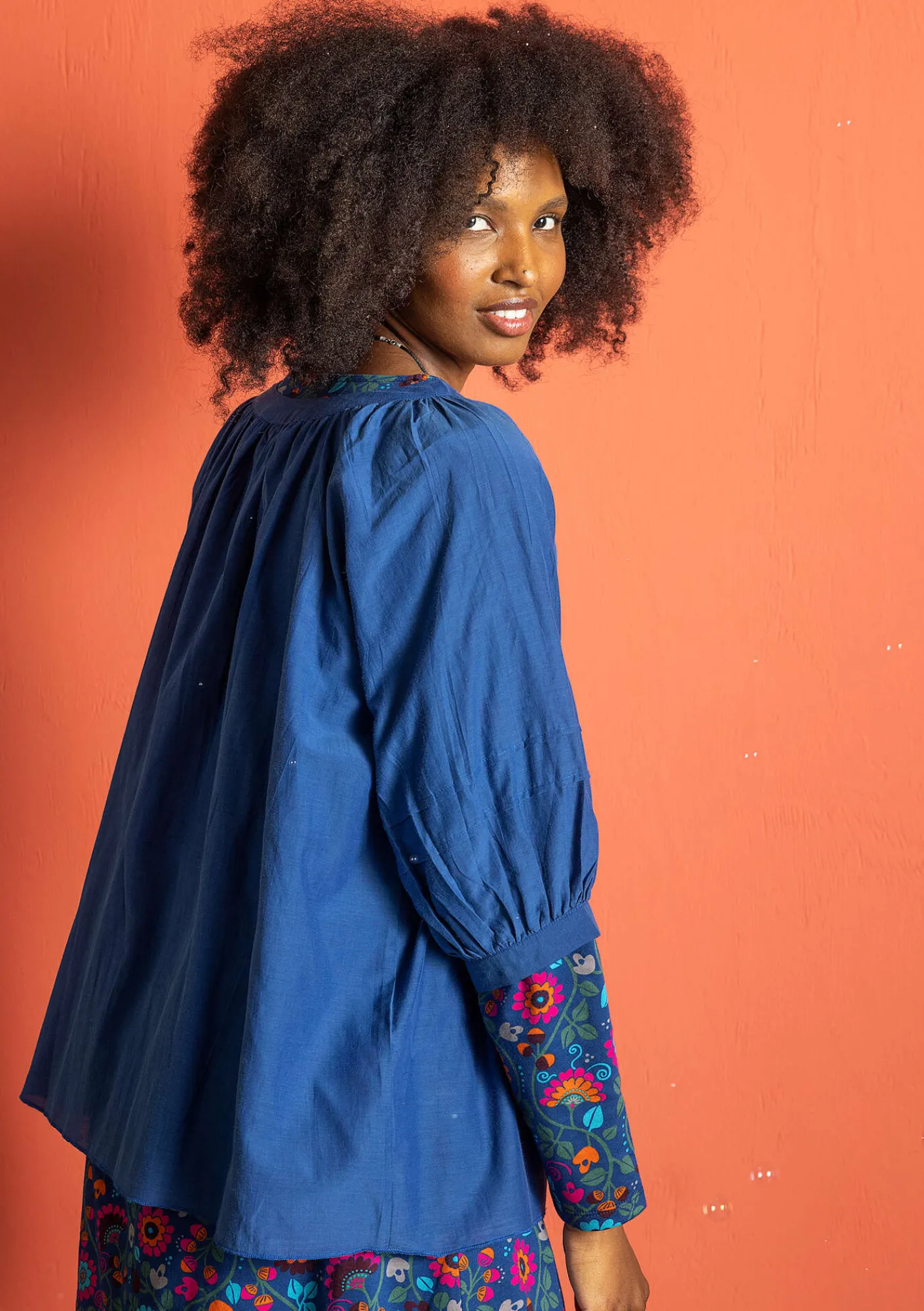 Puffig blus med vacker volym. Rund halsringning med rynkning. Trekvartslång ärm, med två sydda veck, som avslutas nedtill med rynkning.