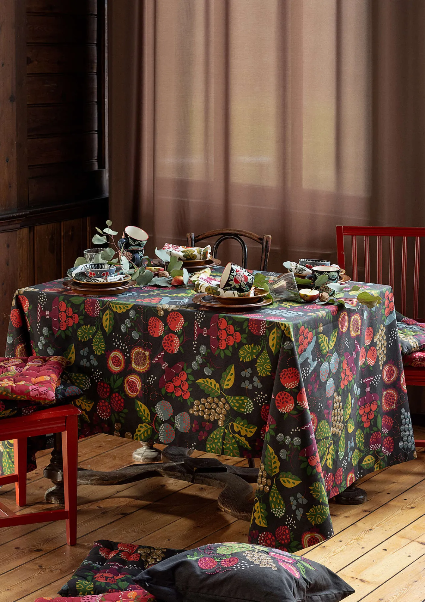 Det blir färgstarkt på bordet med vår duk som är mönstrad med kanderade frukter i vackra färger. Rektangulär modell.