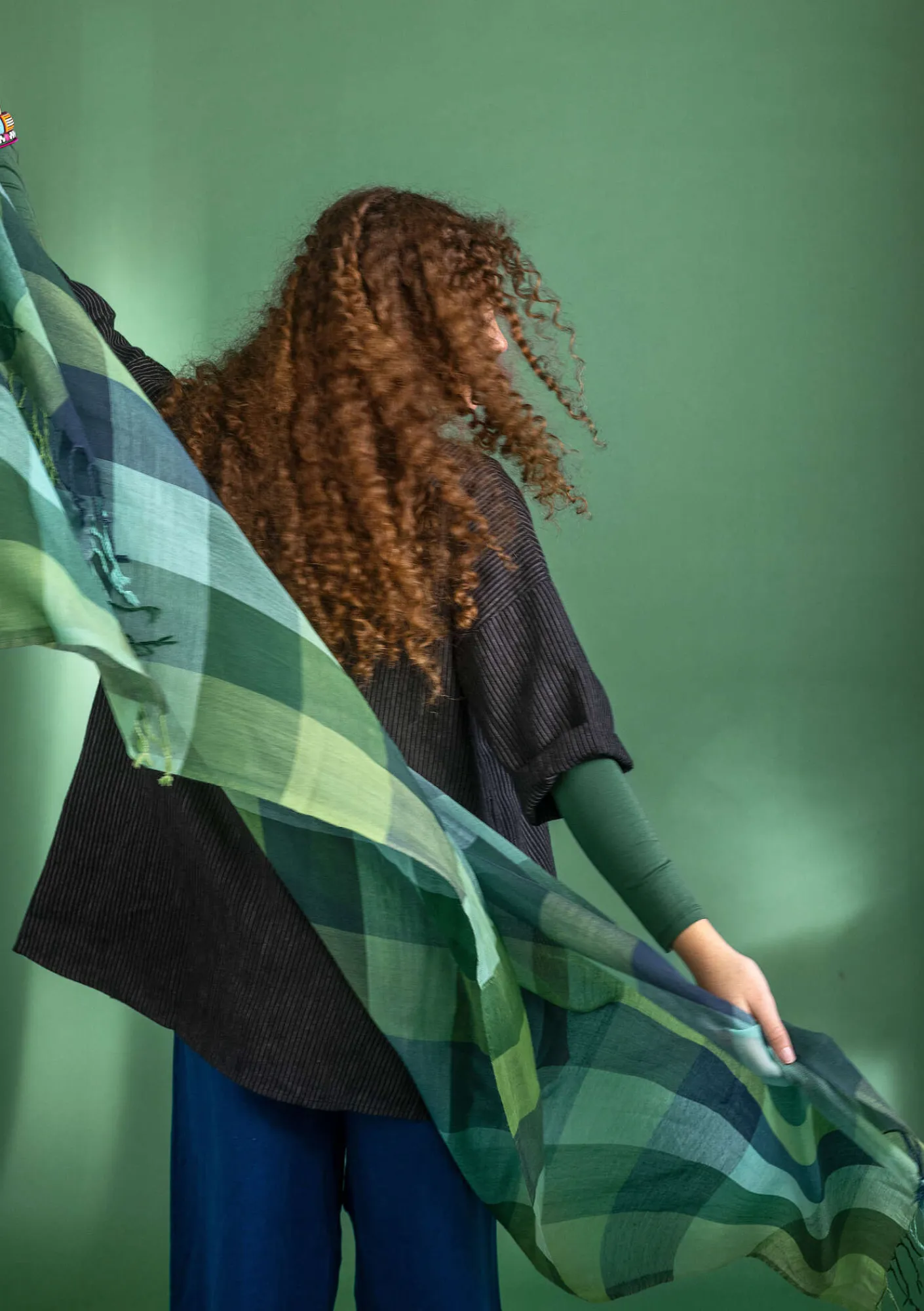 Vår värmande ullsjal i mjuk kvalitet. Pryds av en garnfärgad ruta i oemotståndliga färgställningar. Fransar i kortsidorna.