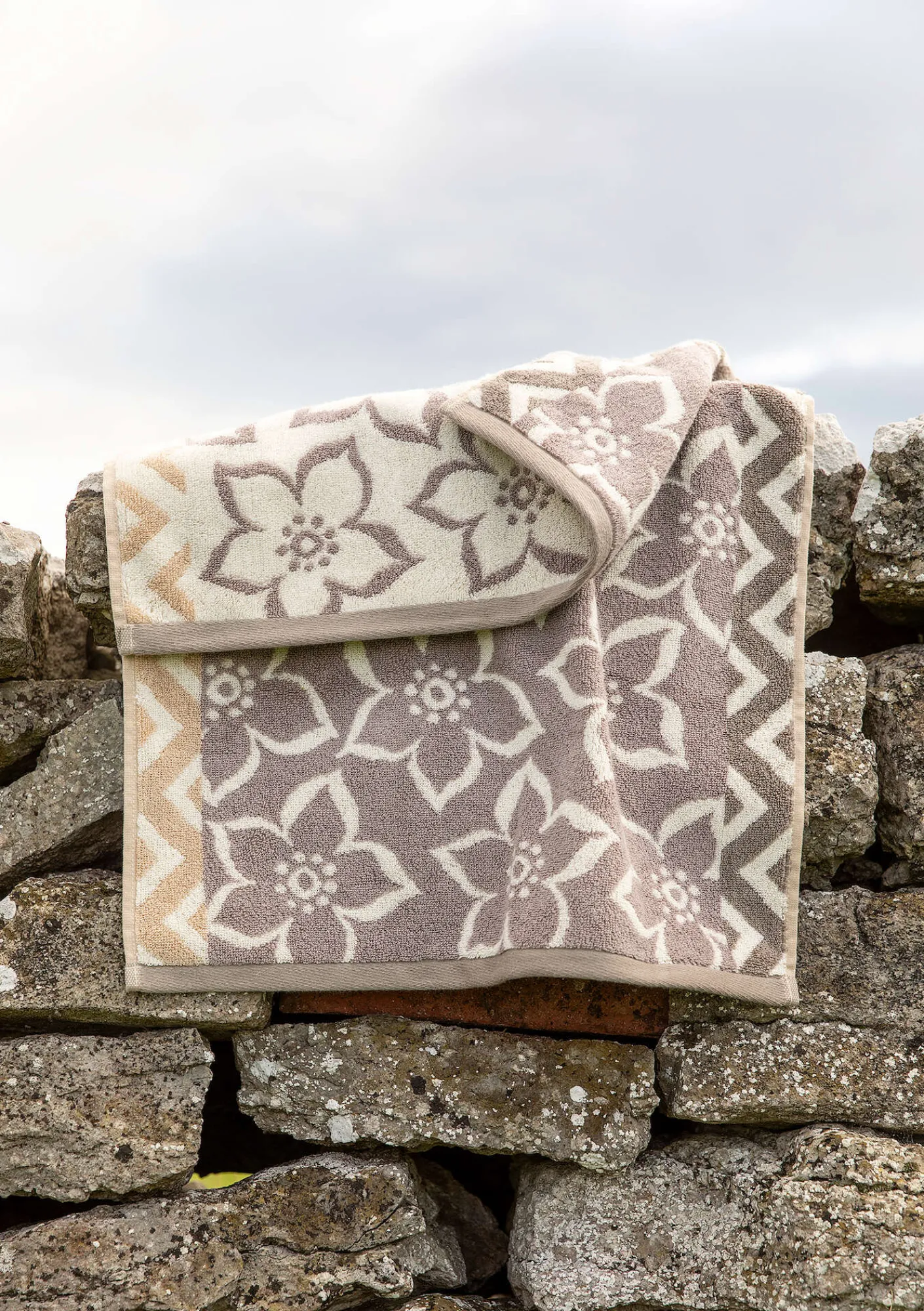 Handduk med blommönster och bårder. Kontrastfärgad kant och hängare på kort- och långsidan.