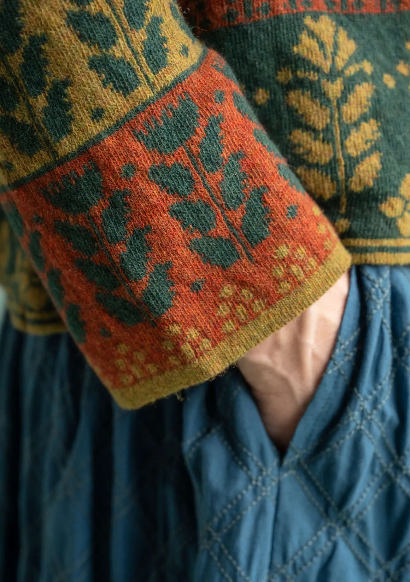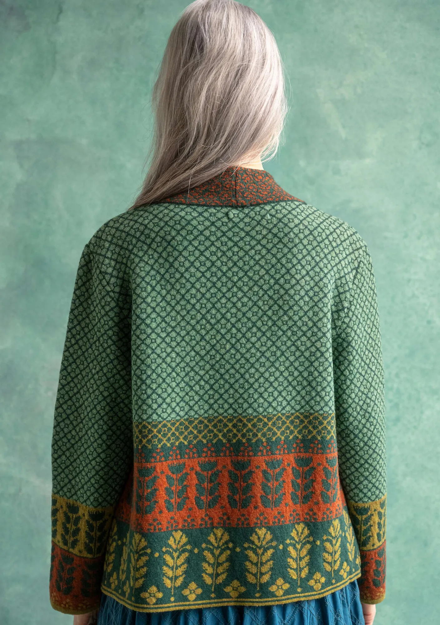 Jacquardstickad omlottkofta med hellång ärm. Vackert mönstrad med olika bårder. En dekorativ pärlemorknapp och en virkad ögla som knäppning.