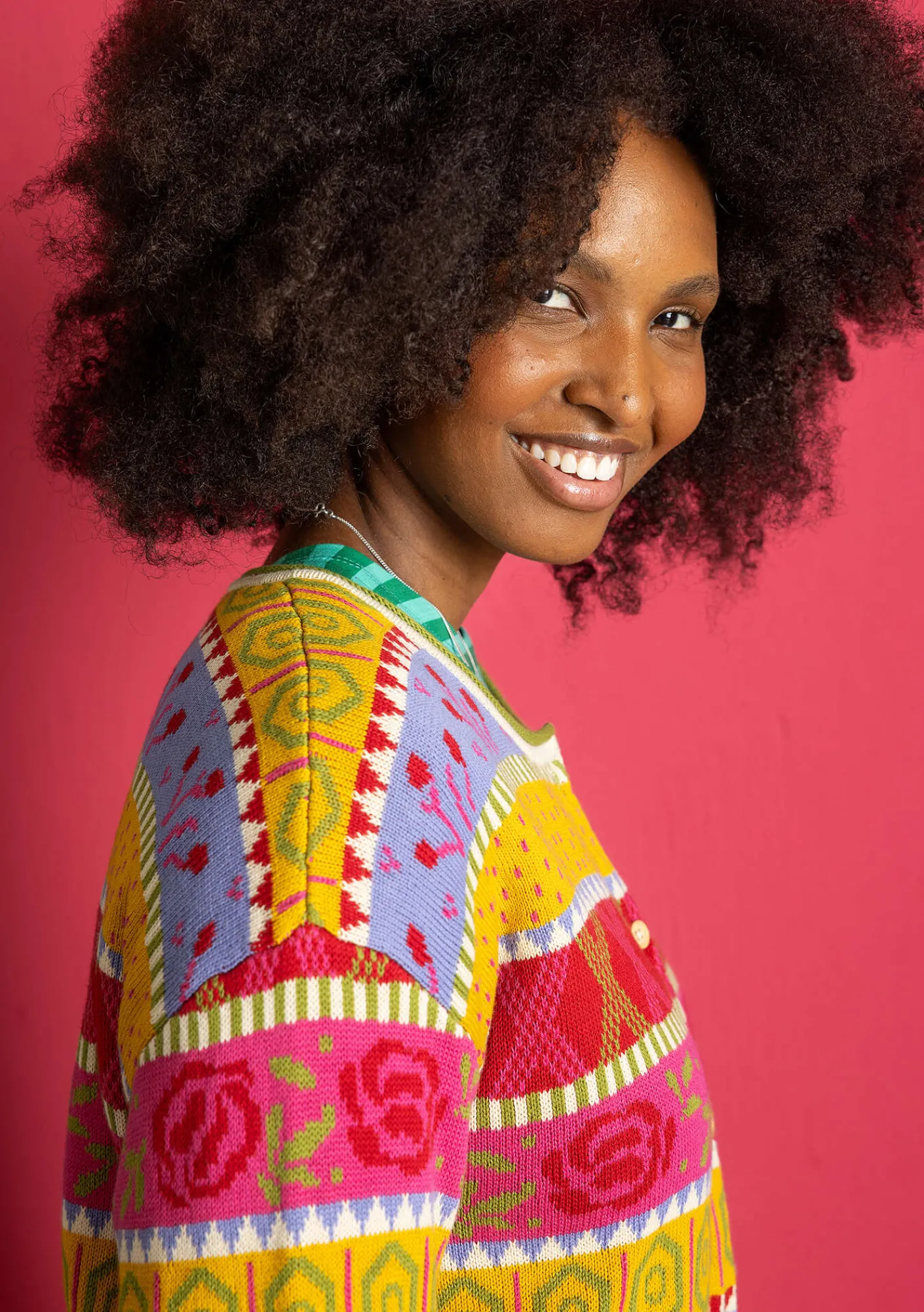 Jacquardstickad kofta i en lite grövre kvalitet. Modell med hellång ärm, rund halsringning och naturfärgade träknappar. Dragsko i midjan som du enkelt drar ihop med en stickad snodd.