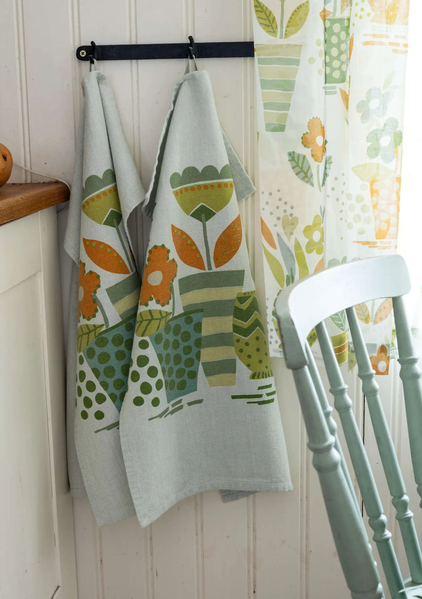 Kökshandduk med ett tryckt motiv av blomkrukor. Gjord i en chambrayväv av ett ekologiskt slubbgarn, vilket skapar en levande yta.