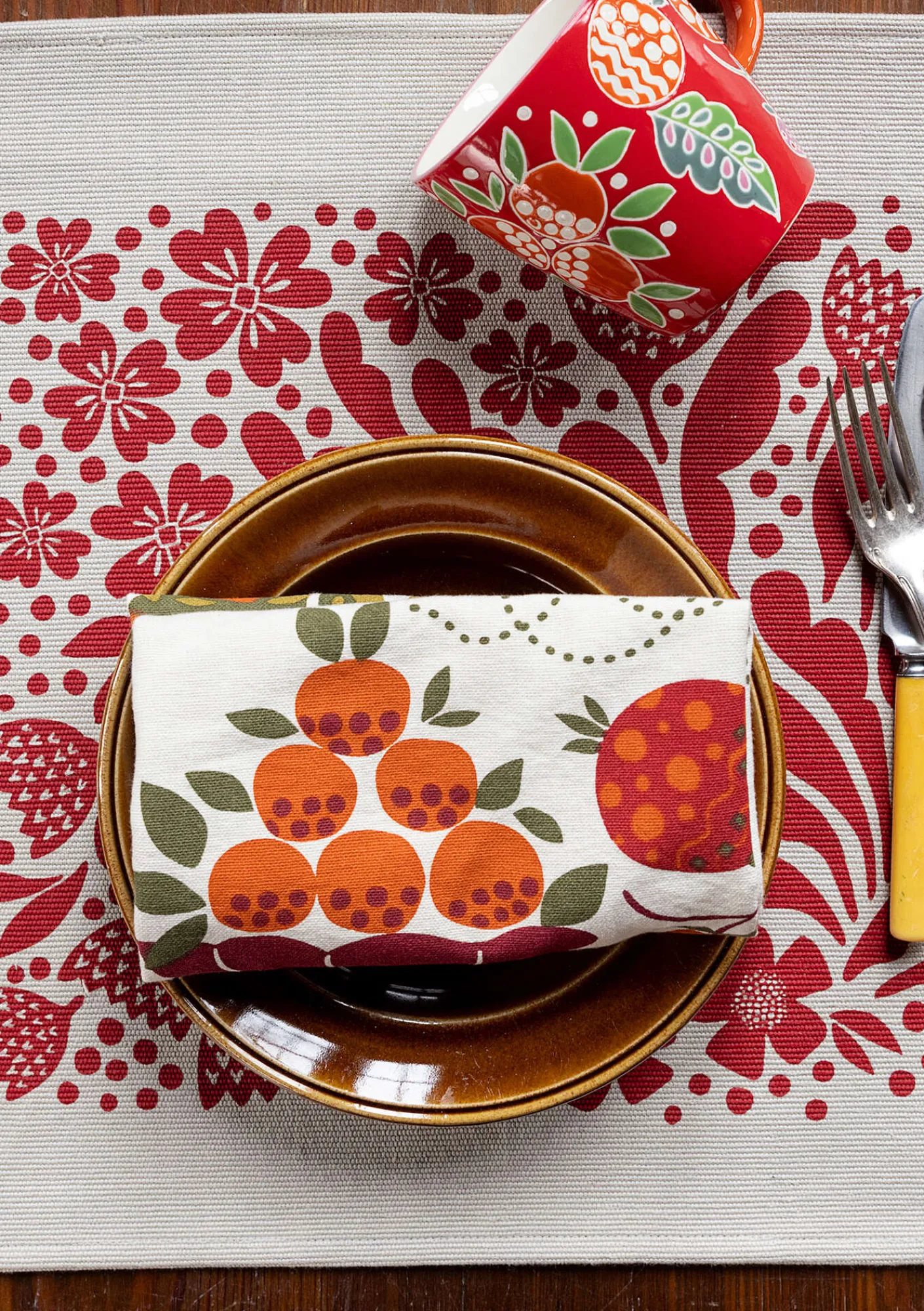 Vår kökshandduk med placerat tryck av frukter skapar ett fint färgspel som verkligen piggar upp i köket. Vävt band för upphängning.