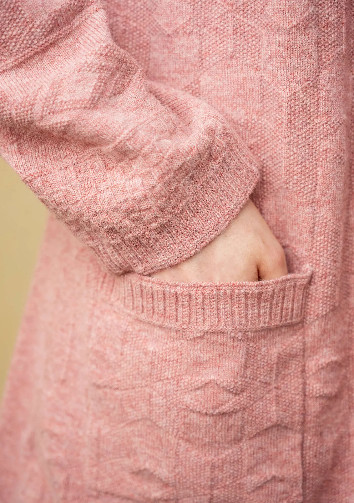 Långkofta med strukturstickade stjärnor och bårder. Rund halsringning, sidslitsar och hellång ärm. Specialstickad ribb i hals, vid ärmslut och på fickans överkant. Träknappar med målad kant och utanpåfickor.