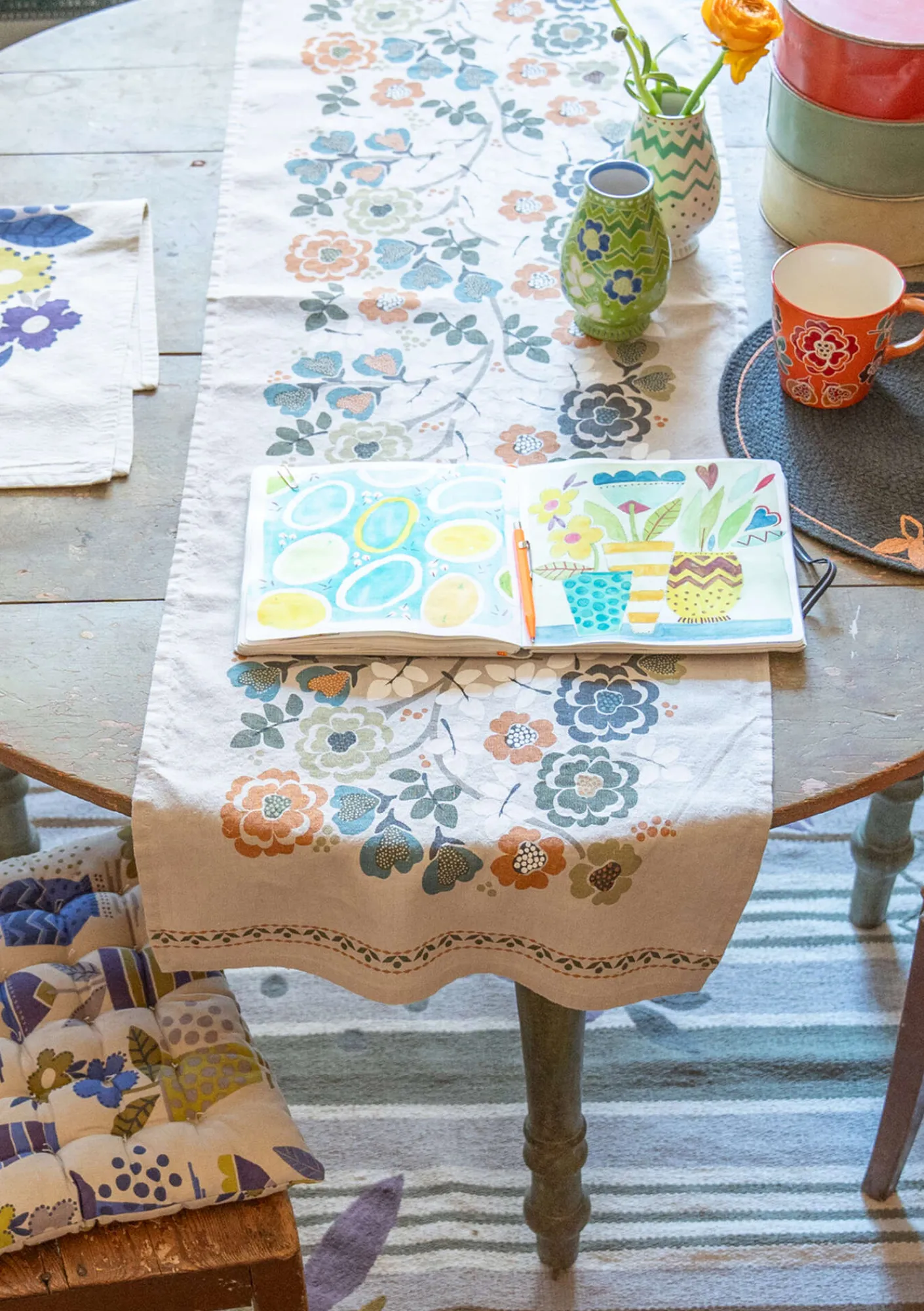 Vacker löpare med det placerade mönstret ”Wild rose” och dekorativa bårder på kortsidorna, screentryckt på en väv i en mix av lin och ekologisk bomull.