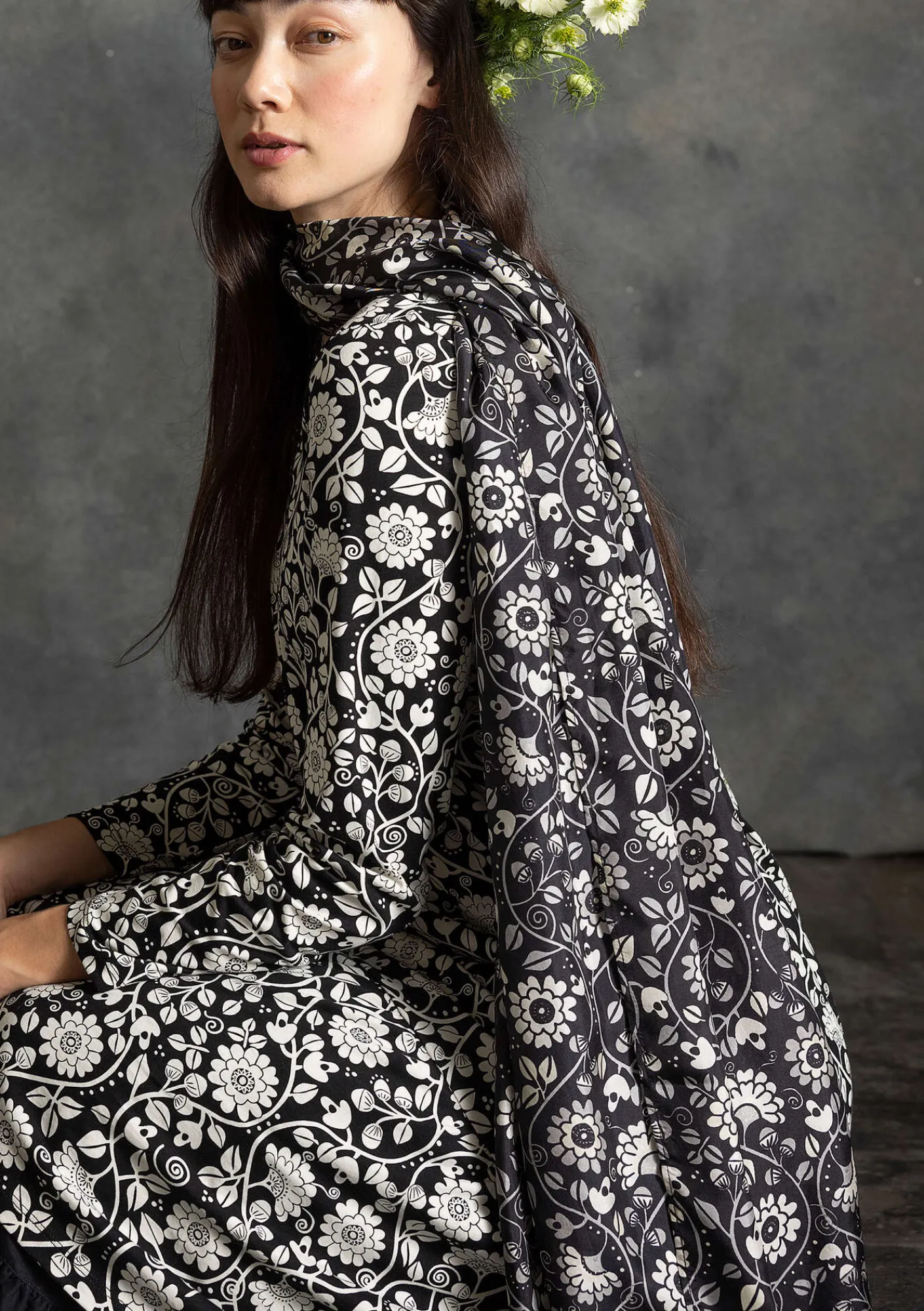 Sjal i underbar sidenväv, rikt mönstrad med tryckt medaljongmotiv av slingrande blommor och blad.