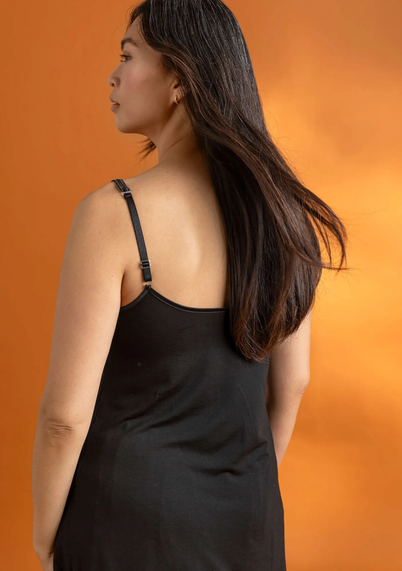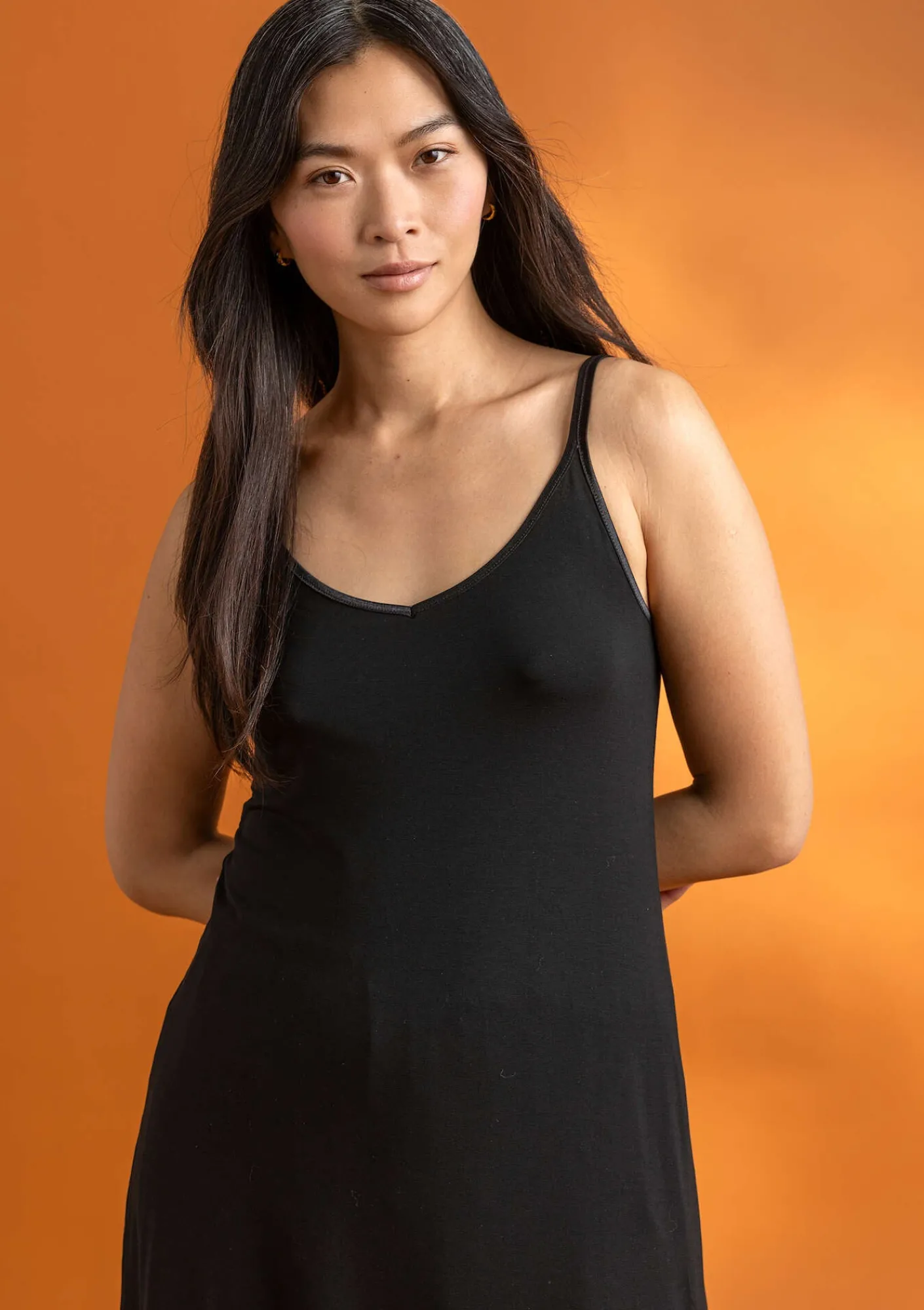 Ärmlös klänning i en mjuk och följsam kvalitet. V-ringad halsringning och lätt rundad baktill. Smala och ställbara axelband. Passar utmärkt även som underklänning.