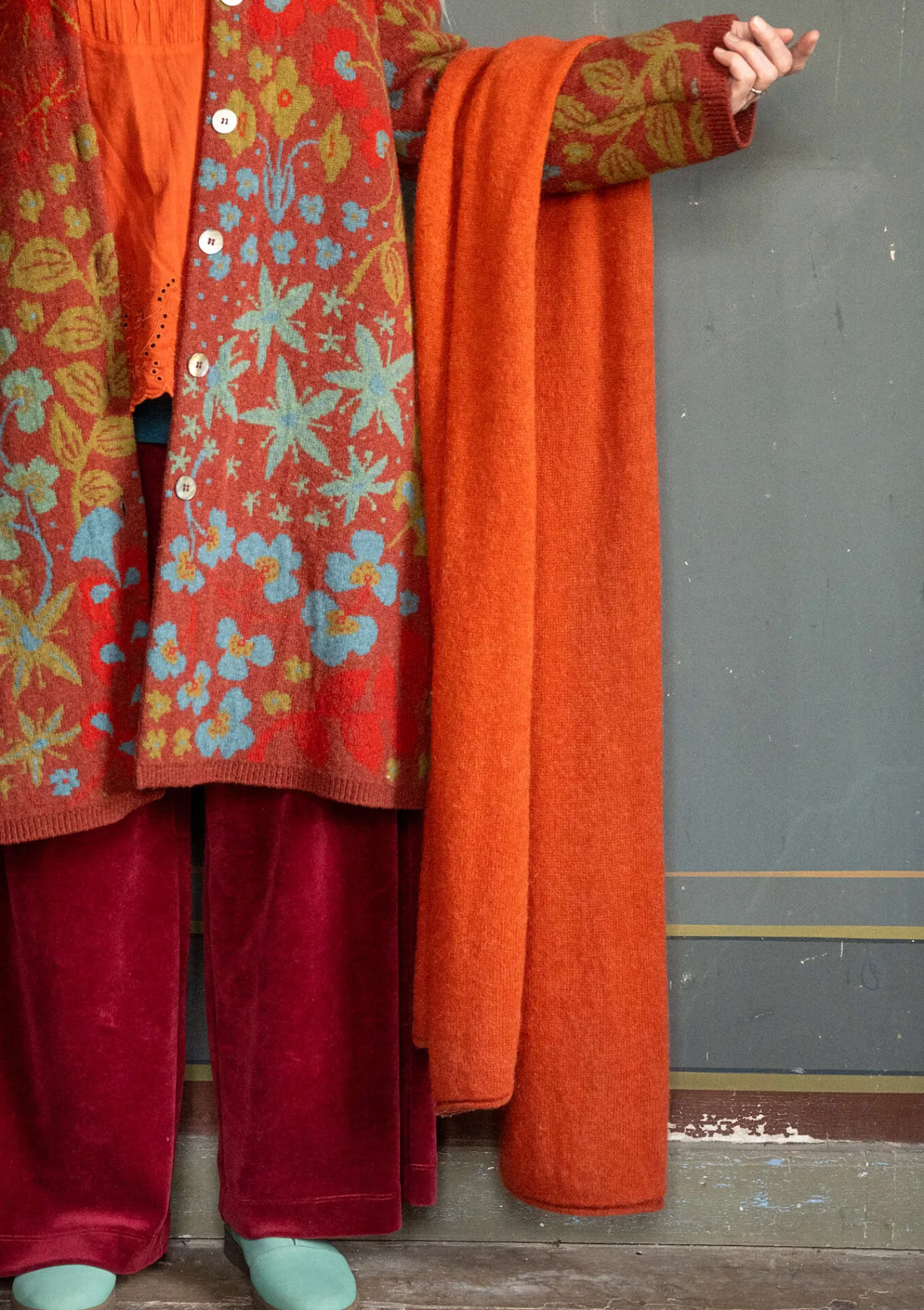 Värmande och lättburen halsduk som avslutas med nätta rullkanter i kortändarna. Stickad i en mjuk och lite fluffig alpacka/ullmix.