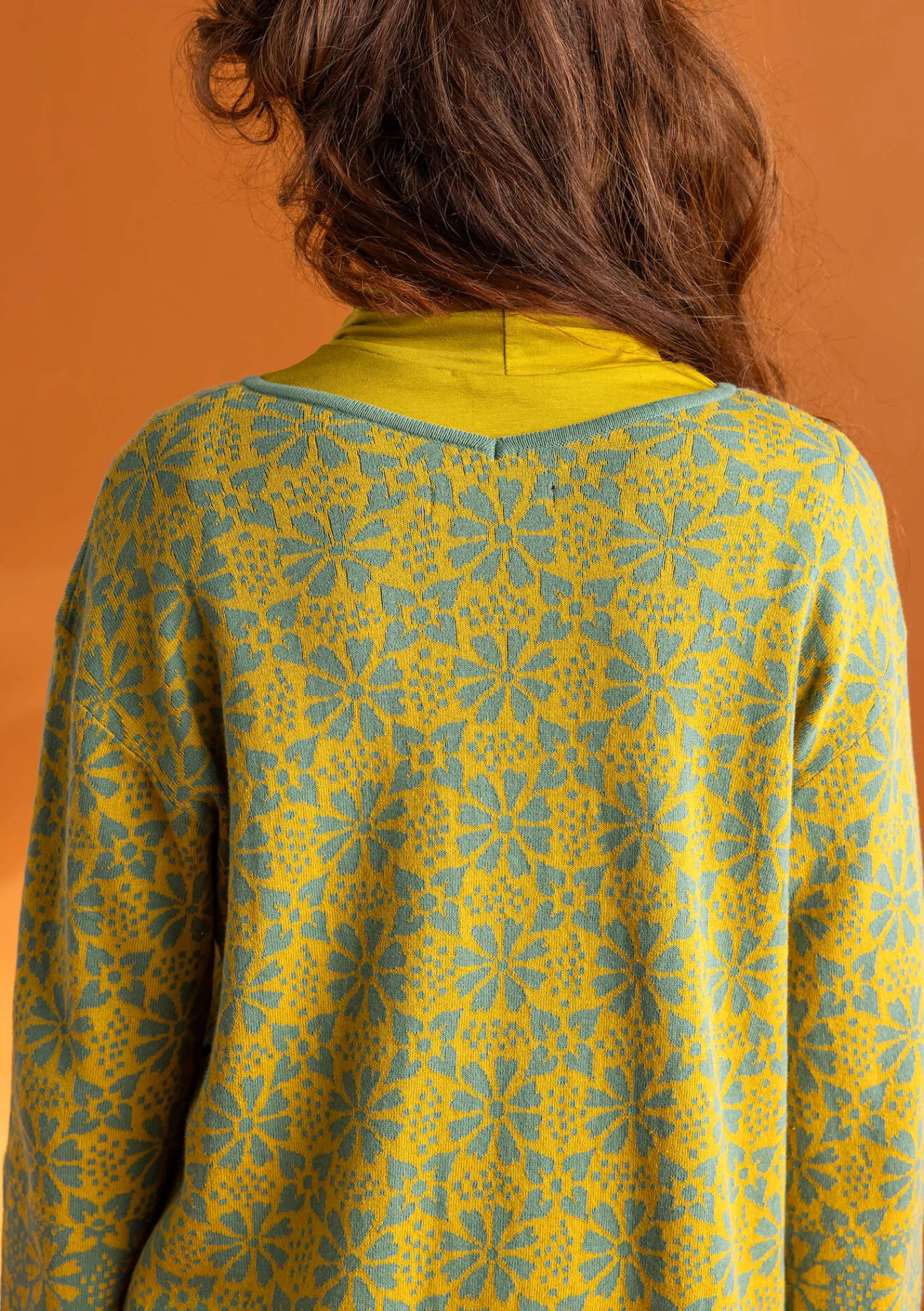 Jacquardstickad tunika med aningen kortare ärm. V-ringad i halsen både fram- och baktill. I ärmens nederkant har vi bytt placering på färgerna, vilket ger plagget en diskret bård.