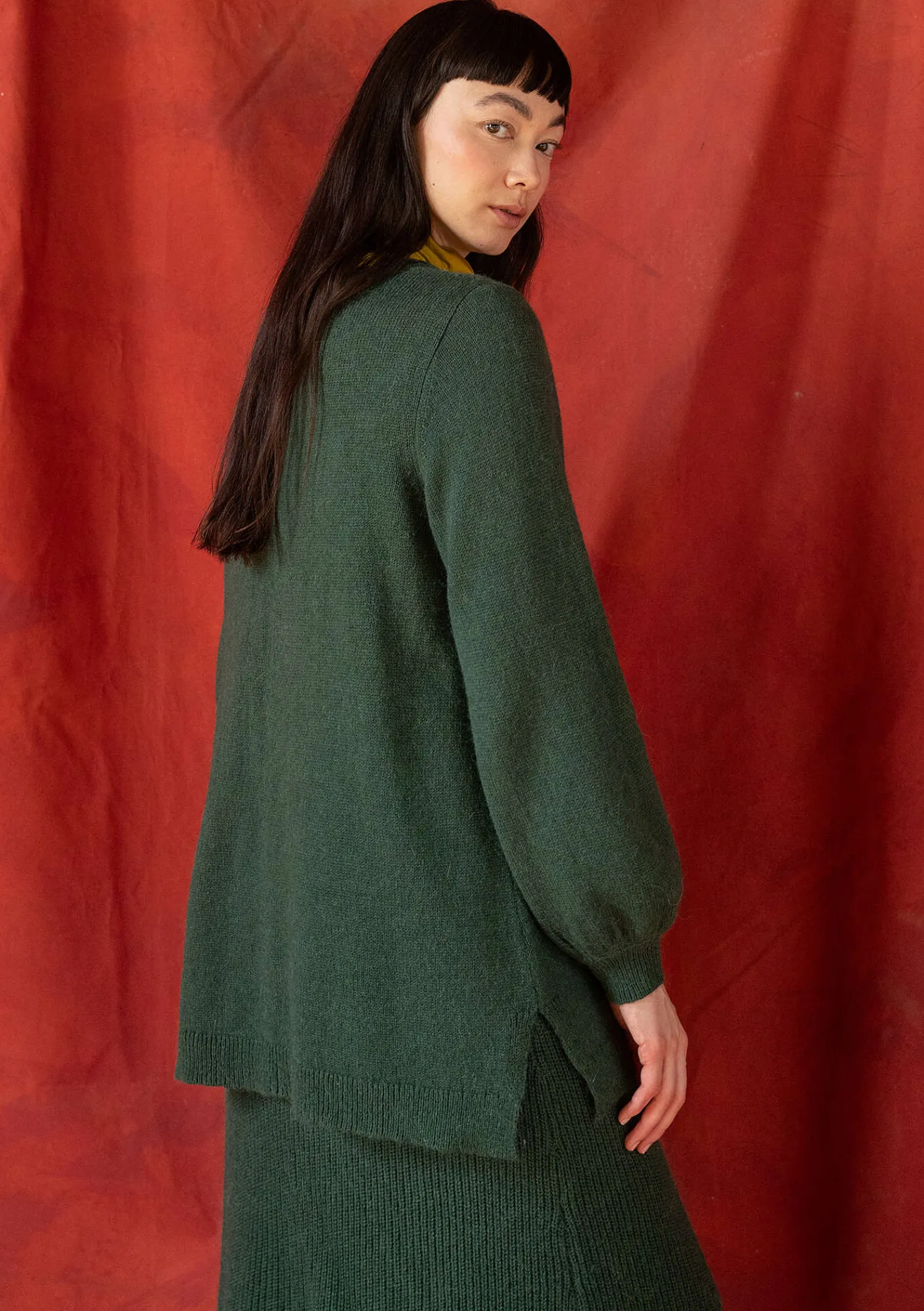 Slätstickad tunika i mjuk alpackamix med sidslitsar. Helång ärm med puff nedtill och rund halsringning med rullkant. Ribbstickad vid ärmslut och i nederkant.