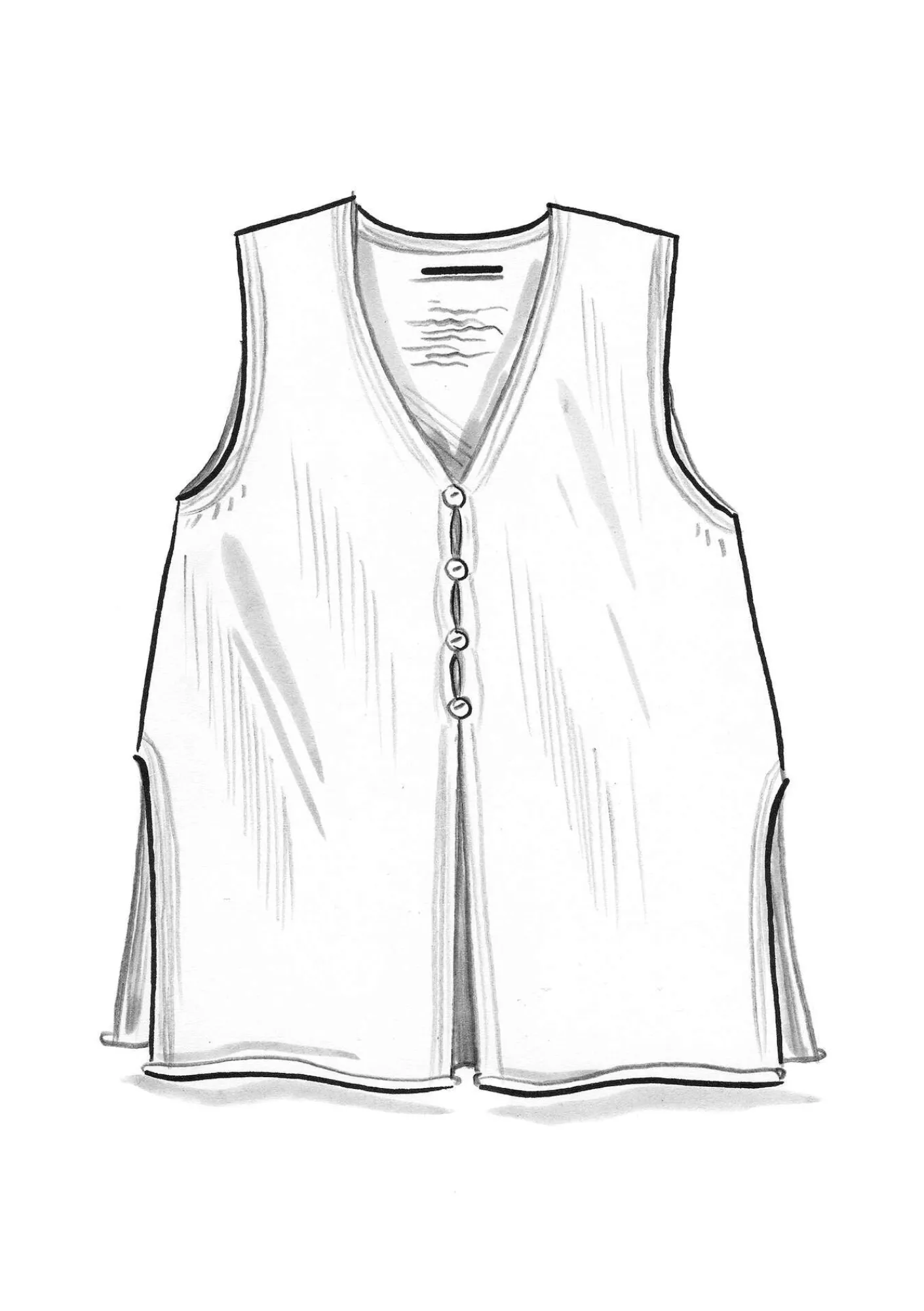 En stickad väst i längre modell. Gjord i vårt mjuka och lite håriga melangegarn. Pärlemorknappar med virkade öglor framtill och slits i sidorna.