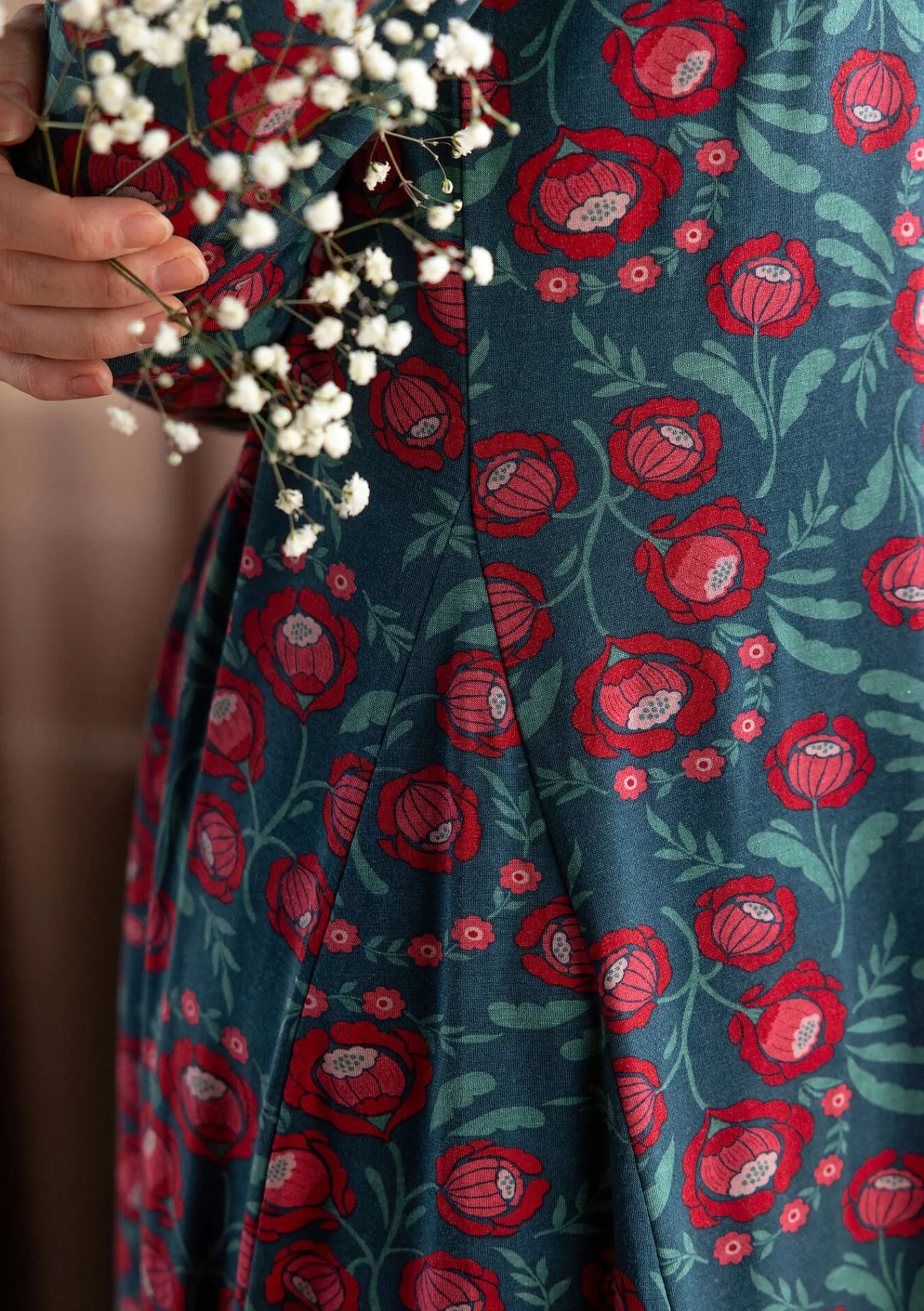 Tryckt trikåklänning i en modell med kilar i sidan. Rund halsringning och hellång ärm.