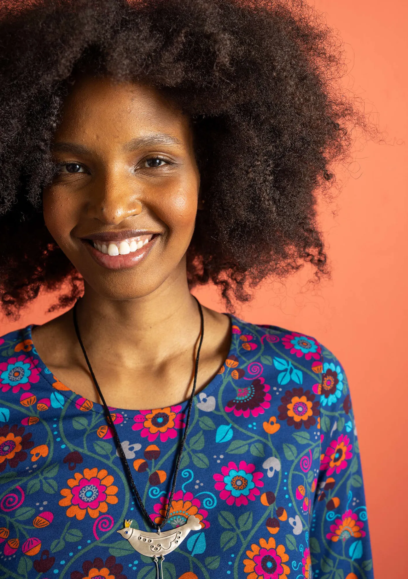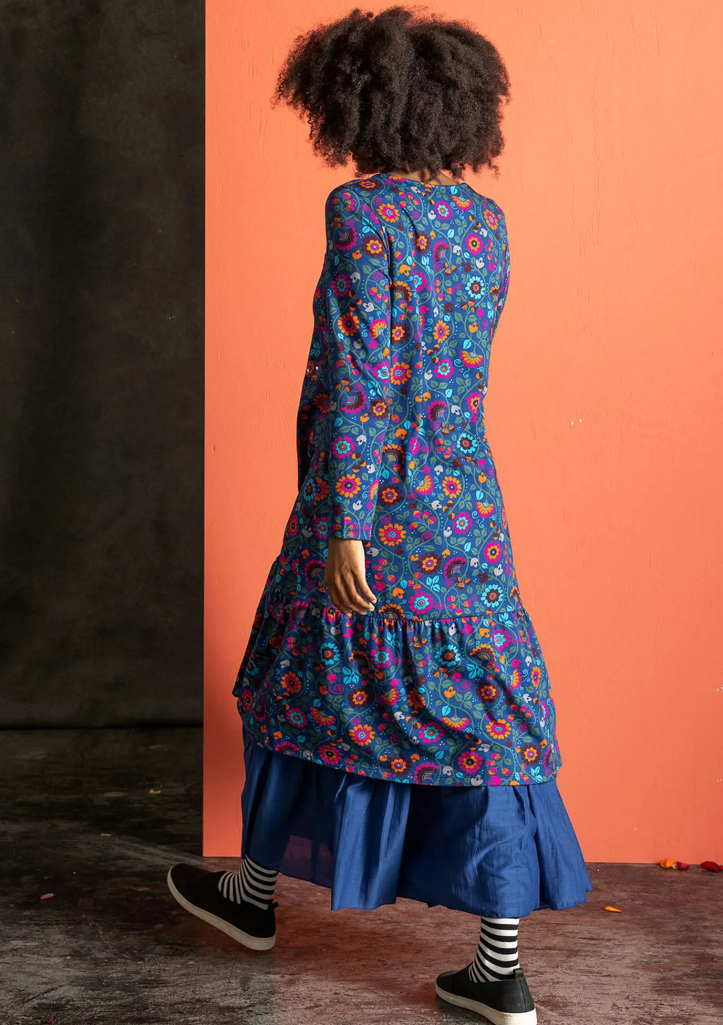 Trikåklänning med ett frodigt mönster med slingrande blad och blommor. Modell med rynkad våd längst ned i kjoldelen, rund halsringning och hellång ärm.