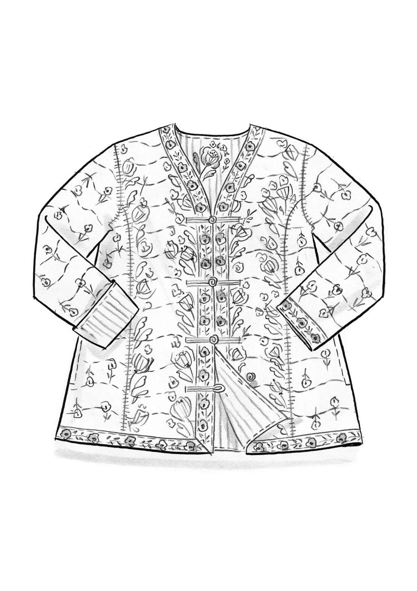 Blocktryckt jacka i en vändbar, rak modell med hellång ärm. Kviltad med ett tunt lager bomullsflanell. Sidfickor och en utanpåficka. Fint arbetad med en broderad blomma på ryggen. Knäpps med textila kinaknappar, i klassisk modell.