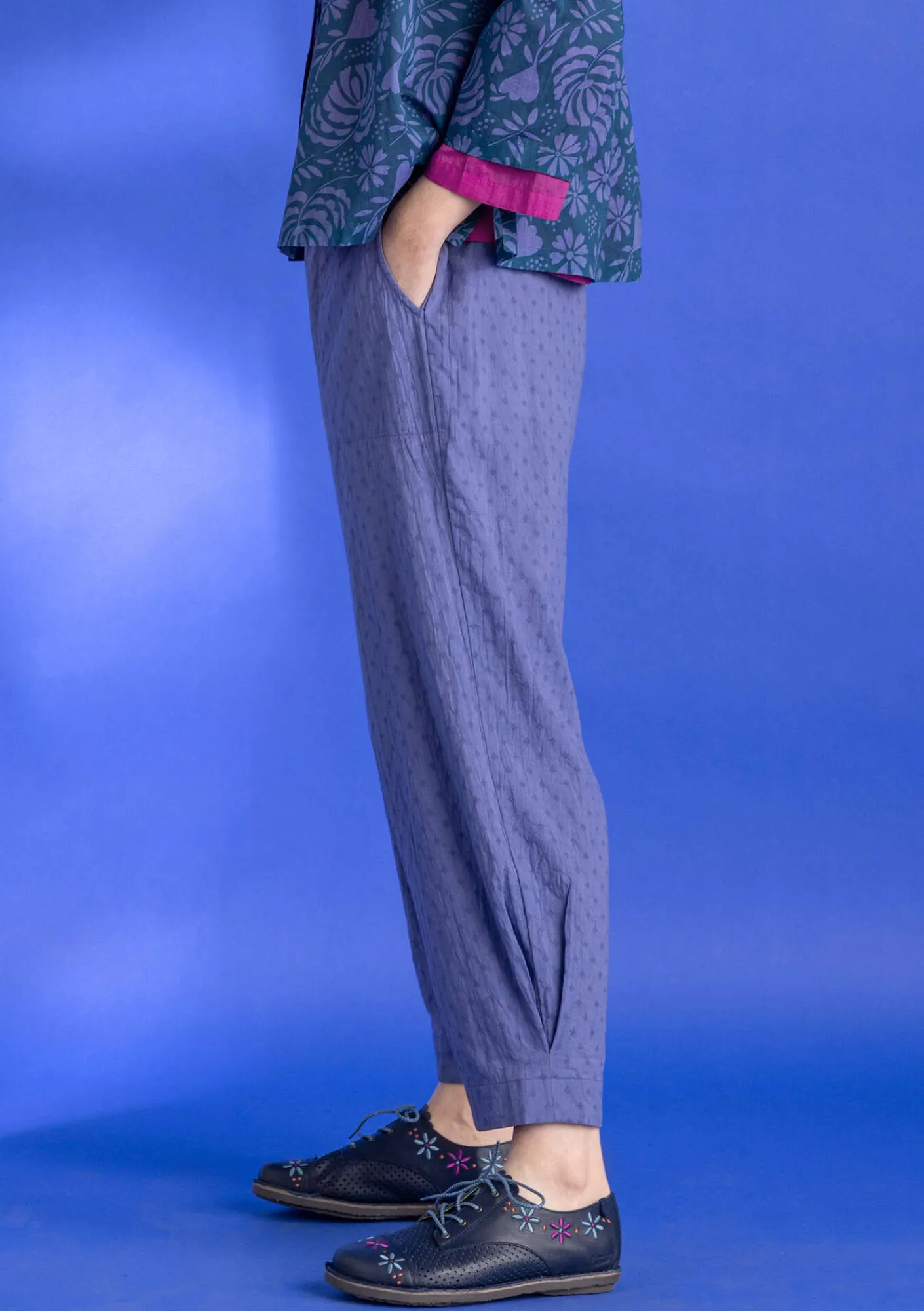 Ankellång byxa. Gjord i en dobbyväv, som ger det enfärgade plagget en strukturmönstring. Motveck i benets nederkant ger en lätt puffeffekt. Fickor i sidan och bekväm resår i midjan.