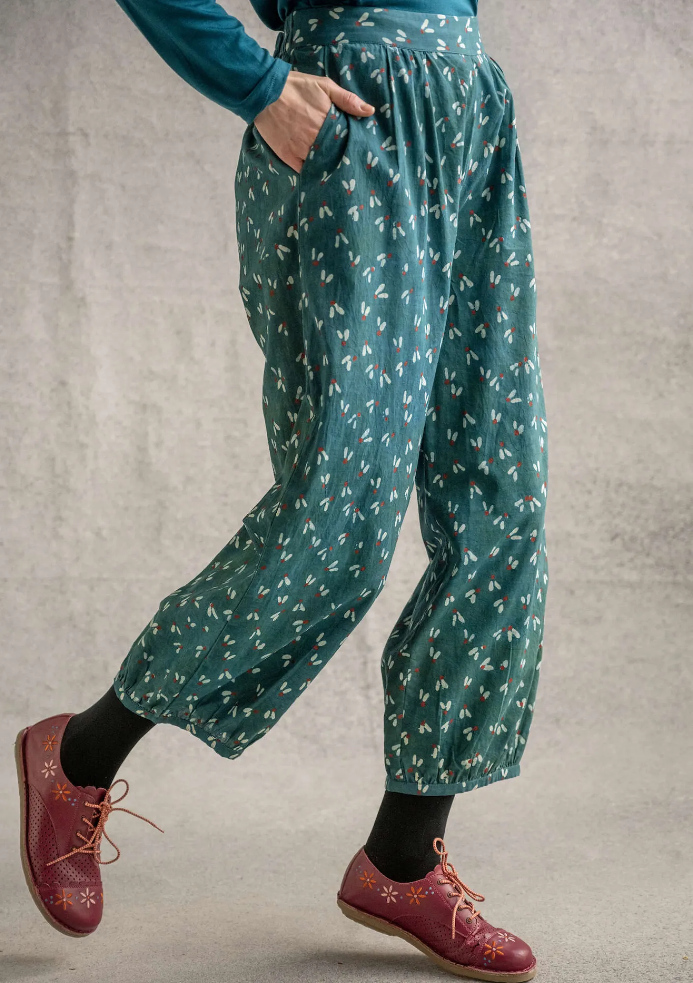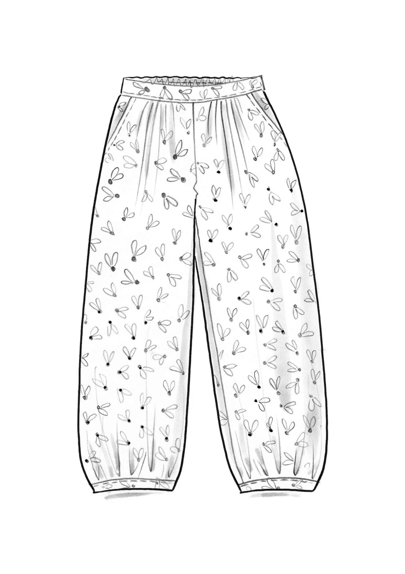 Småmönstrad puffbyxa som blocktryckts med lera och doppats i olika färgbad med växtpigment. Modell med insydd resår midjan och praktiska sidfickor.