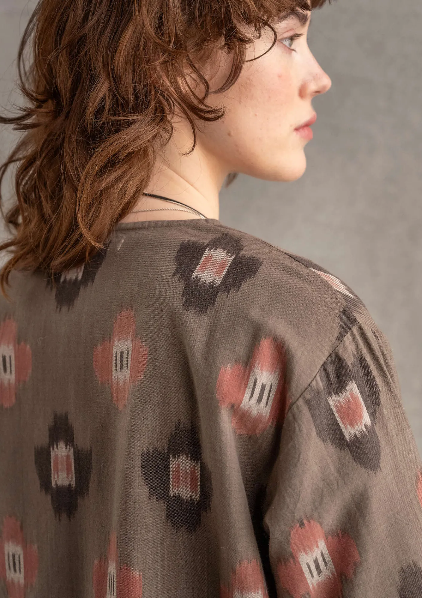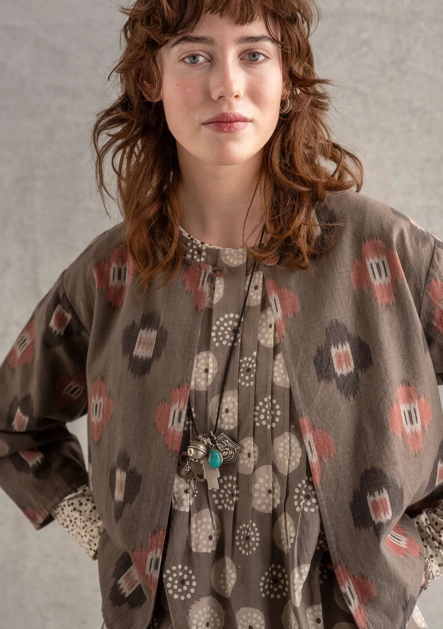 Ikatvävd jacka i en blommig mönstring. Lätt utställd modell med rund halsringning och trekvartslång ärm. Knäpps med en enkel tygklädd knapp.