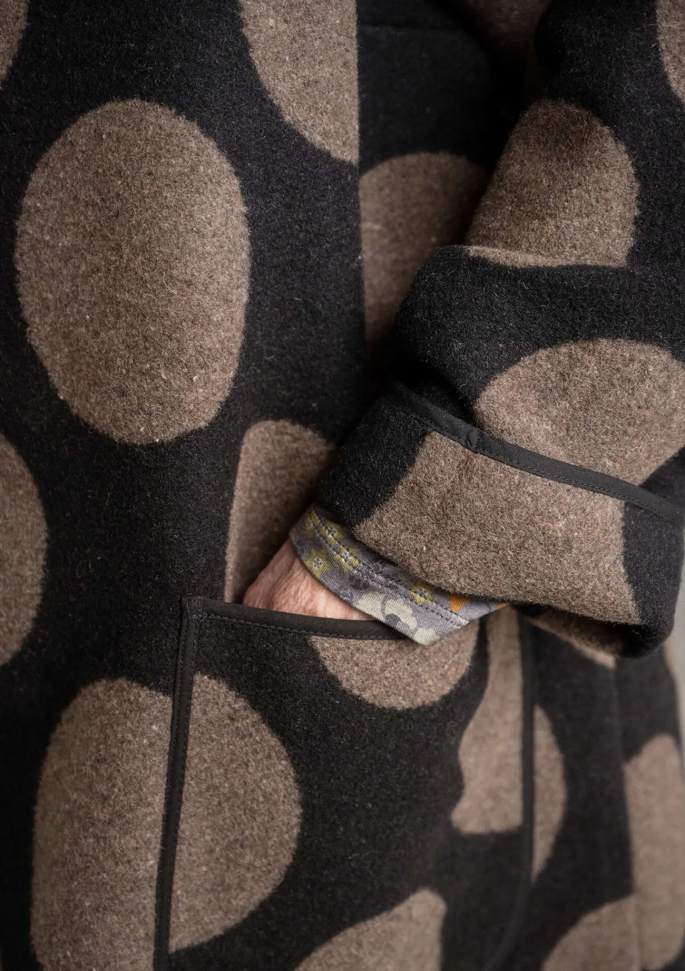 Jacquardvävd kappa med stora härliga prickar. Bandkantad modell med hellång raglanskuren ärm, hög krage och utanpåfickor. Knappar i naturfärgad kokos.
