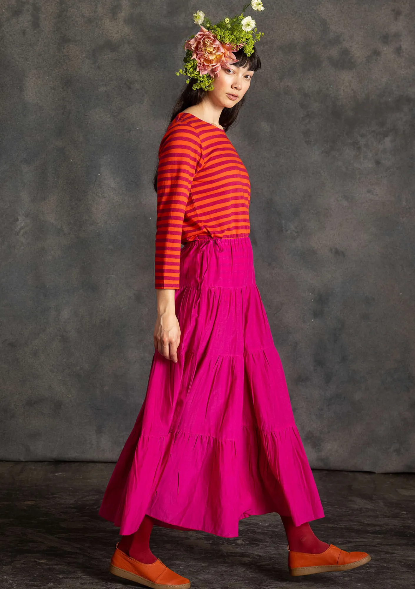 Kjol i härlig siden/bomullsväv med fint fall och mycket vidd. Fin modell sydd i fyra våder, dragsko samt bekväm resår i midjan.