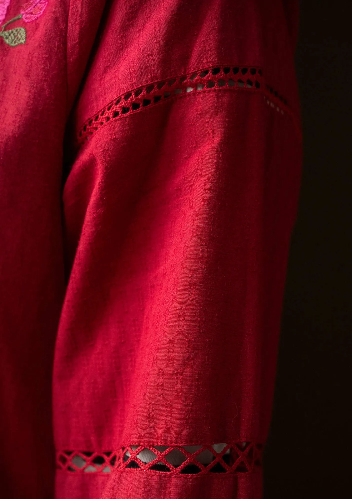 Dobbyvävd klänning i en lite stadigare kvalitet. Helt genomknäppt modell sydd i våder med bårder på kjoldelen, både fram- och baktill. Hellång puffärm med inlagda spetsband och broderier. Även rikt broderat framstycke. Rund halsringning med en kort veckad ståkrage samt matchande pärlemorknappar.