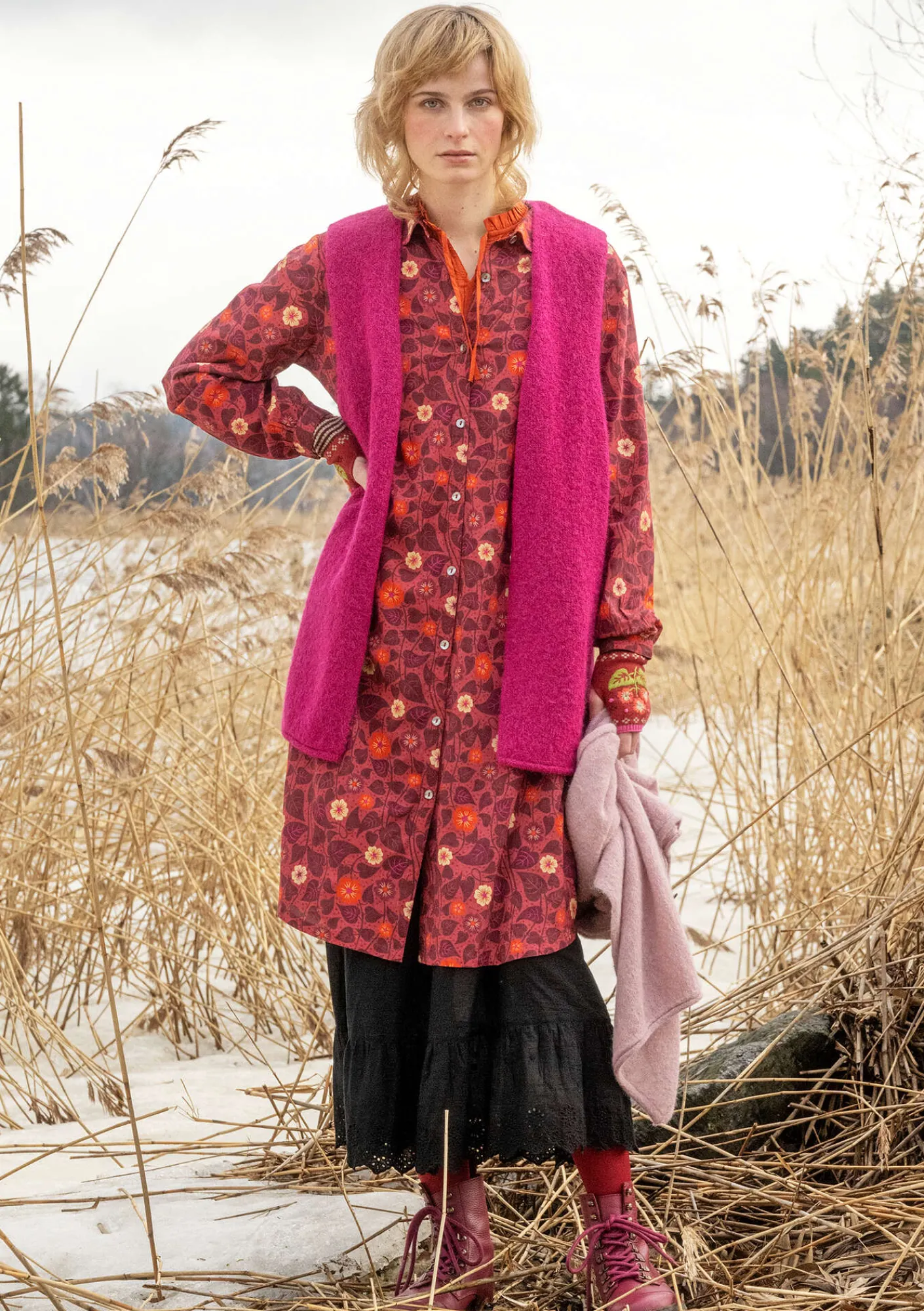 Digitaltryckt skjortklänning, sydd i en dobbyvävd kvalitet med lite struktur. Helt genomknäppt modell med en liten krage. Avskuren i midjan med rynkning baktill och i sidorna på framstycket. Knäpps med pärlemorknappar samt även en liten knapp vid ärmsluten.