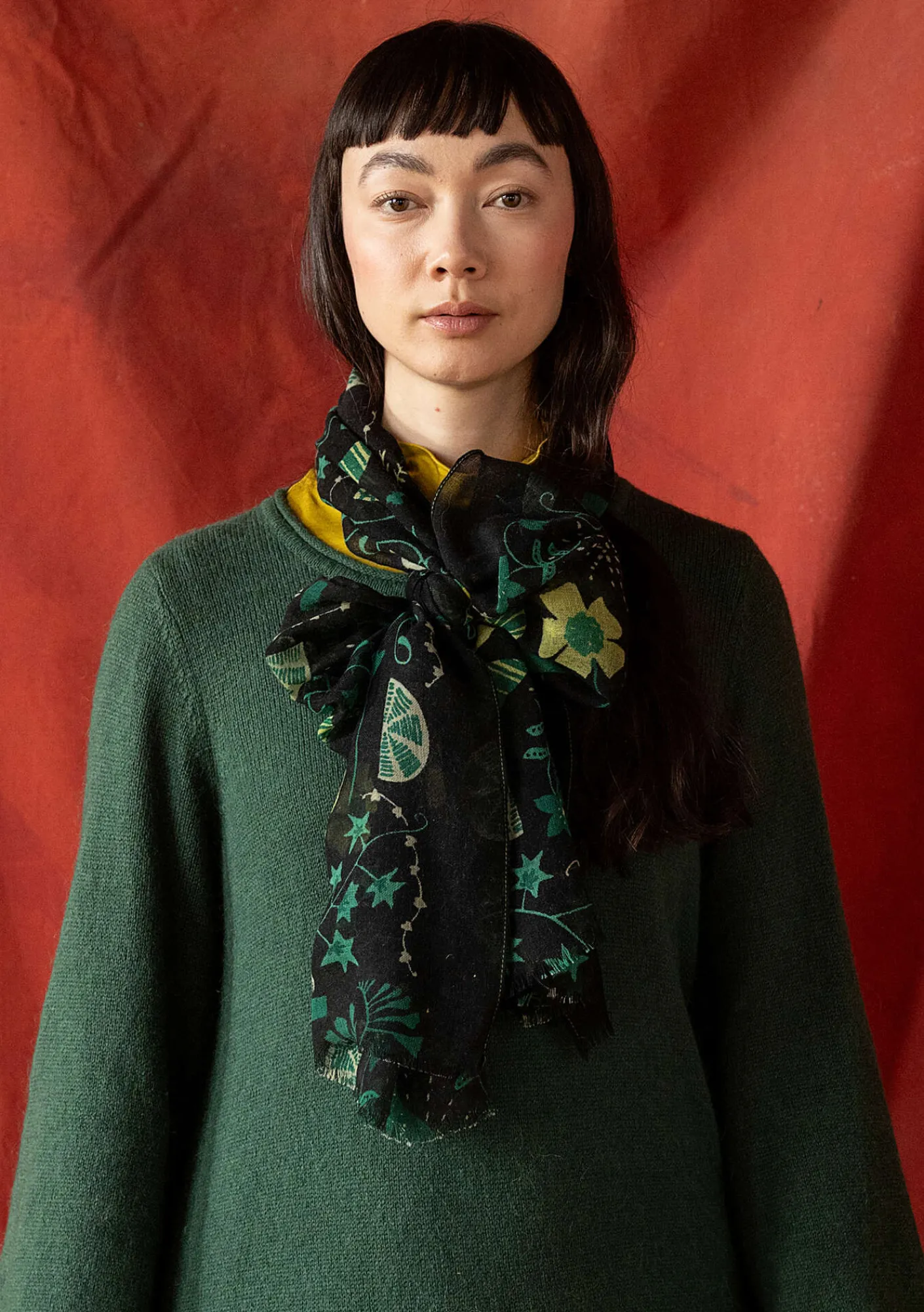 Tryckt ullsjal, med placerat mönster, i en rik mönsterbild. Fållad långsida med tråd i accentfärg. Ofållad kortsida som ger en kort och naturlig frans.