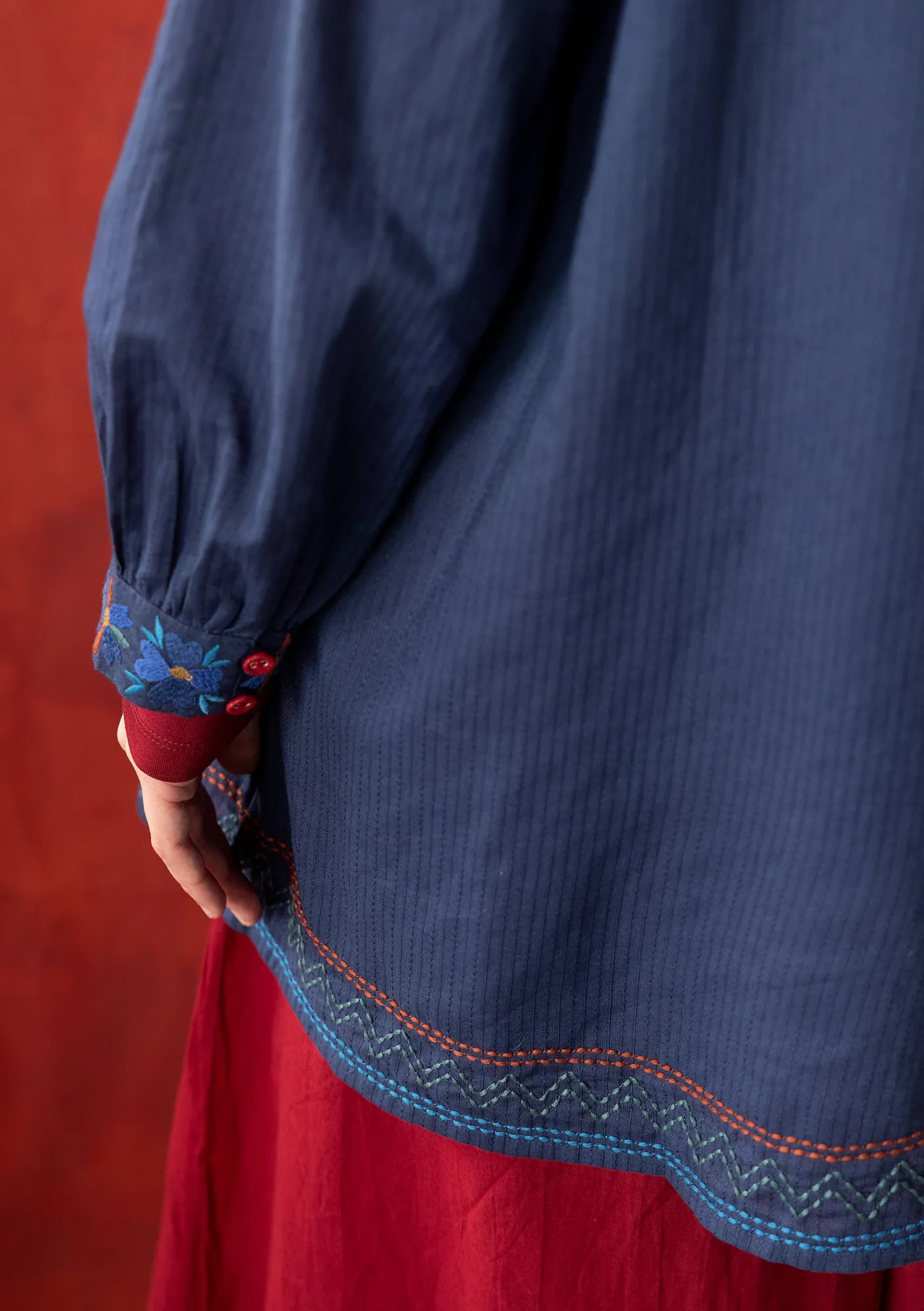 Vävd tunika med vackra broderier på både framstycke, runt manchetter och som en bård vid plaggets nederkant. Modell med hellång ärm och ett ok med rynkning framtill. Rund halsringning som är bandkantad i accentfärg. Tygklädda knappar i accentfärg vid oket och ärmsluten.