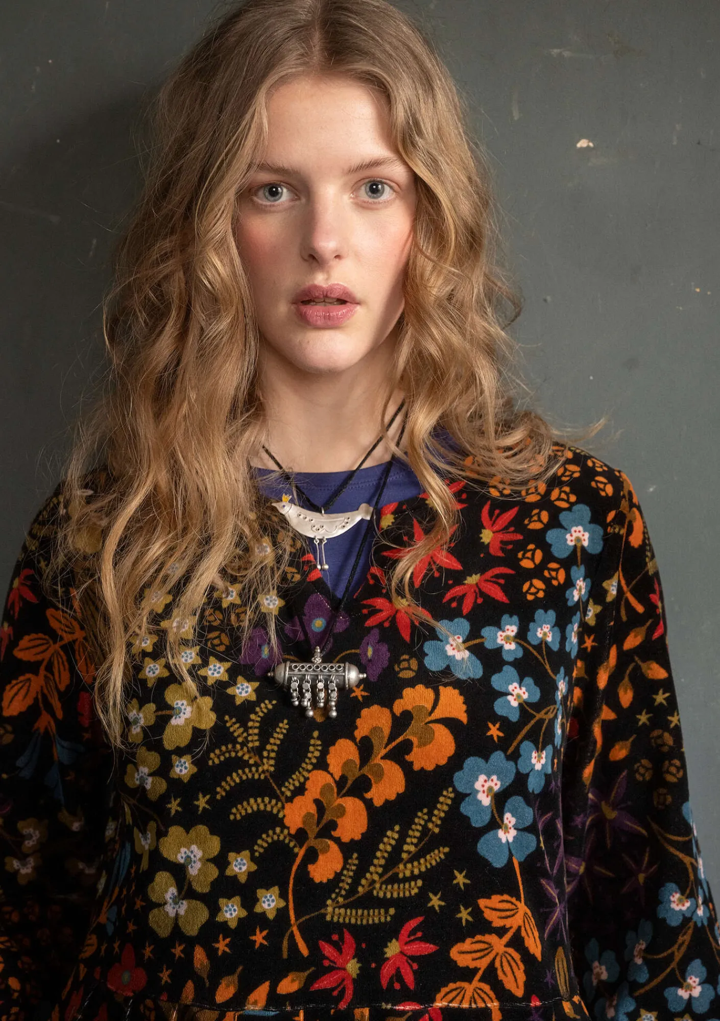 Tryckt velourklänning, avskuren i midjan med lagda veck i kjoldelen. Trekvartslång ärm med lite puff, sidfickor och rund halsringning med ett kort sprund framtill. Två färgställningar i tvåfärgstryck och en tredje mulifärgad med en dekorativ guldfärgad tråd som stickning i halsringningen.