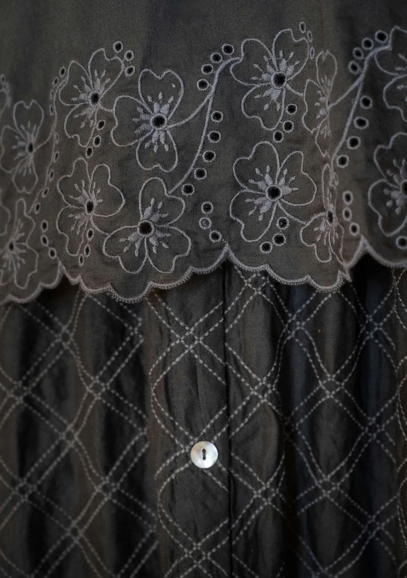 Enfärgad blus i en modell med hellång ärm. Fint arbetad med stråveck upptill och en dekorativt veckad krage med knytband. En ton-i-ton broderad bård med engelsk hålsöm nedtill och vid ärmsluten.