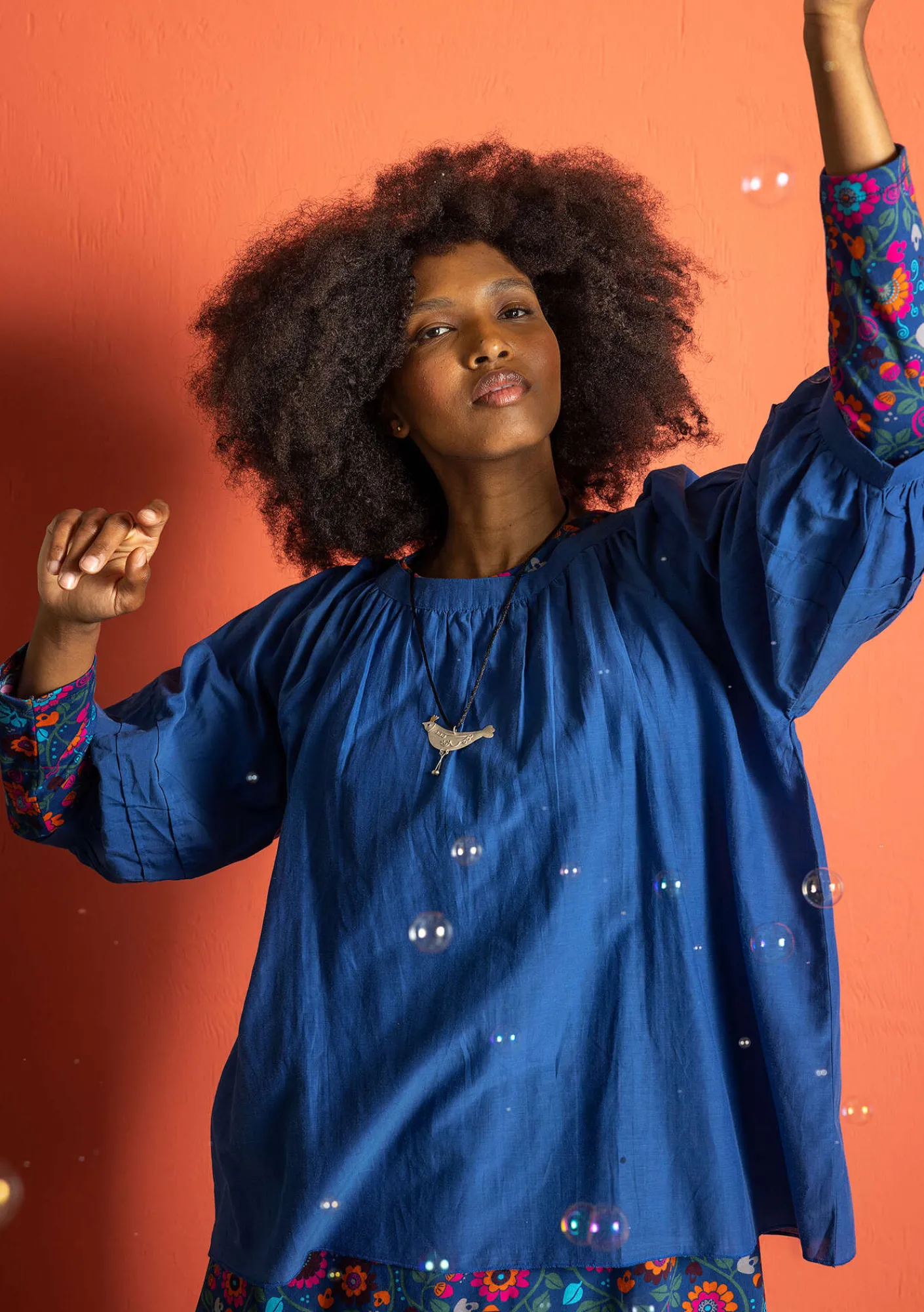 Puffig blus med vacker volym. Rund halsringning med rynkning. Trekvartslång ärm, med två sydda veck, som avslutas nedtill med rynkning.