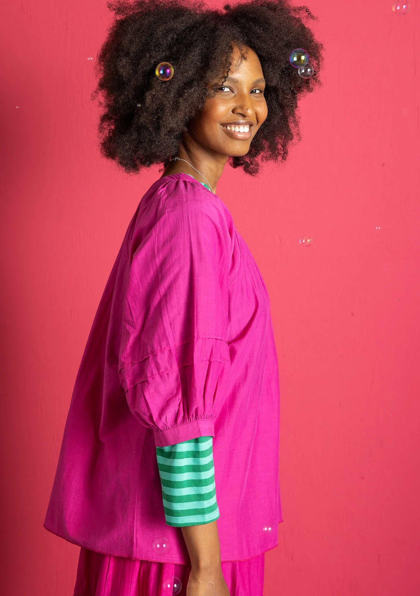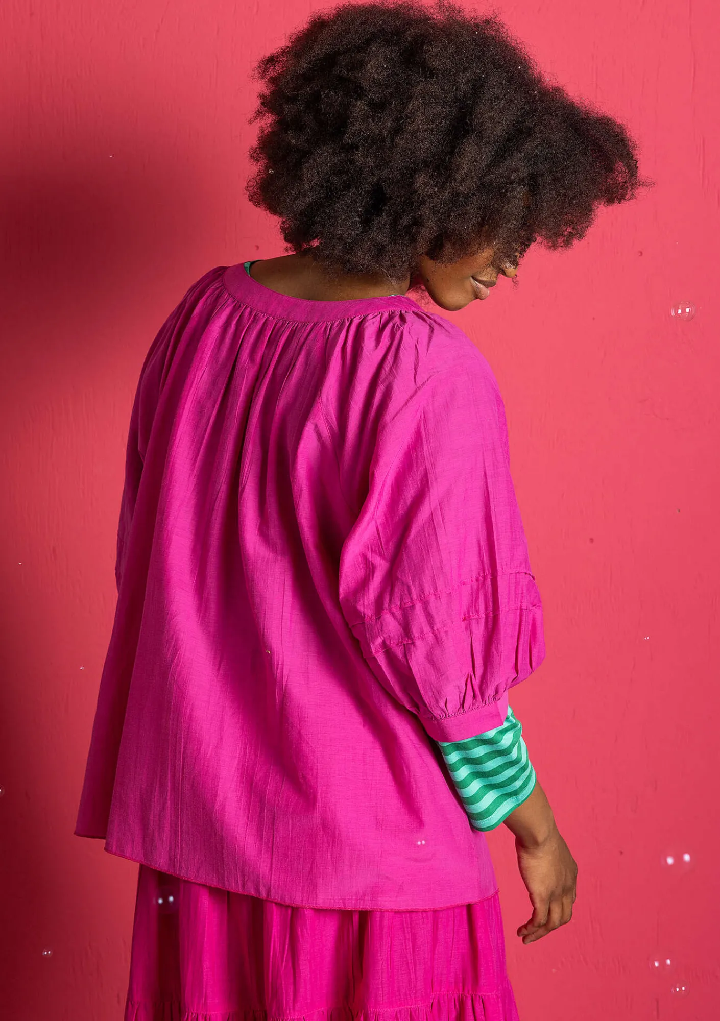 Puffig blus med vacker volym. Rund halsringning med rynkning. Trekvartslång ärm, med två sydda veck, som avslutas nedtill med rynkning.