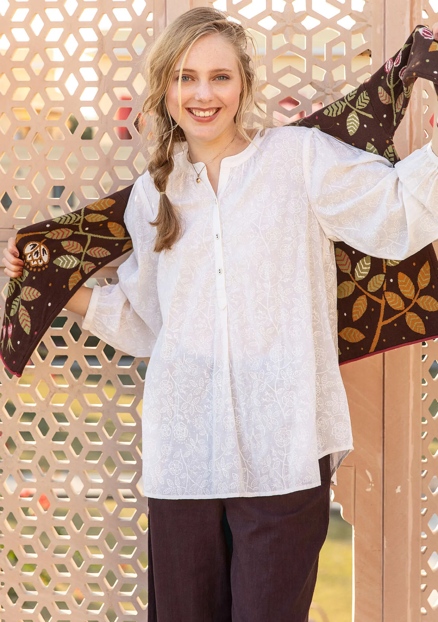 Blocktryckt blus med sirliga nyponrosor. Modell som är rundad i nederkant och har en knäppslå upptill som avslutas med ett motveck, vilket ger plagget extra vidd. Farfarskrage, klädda knappar och ett ok på bakstycket. Hellång puffärm med en passpoalkant längs axelsömmen.