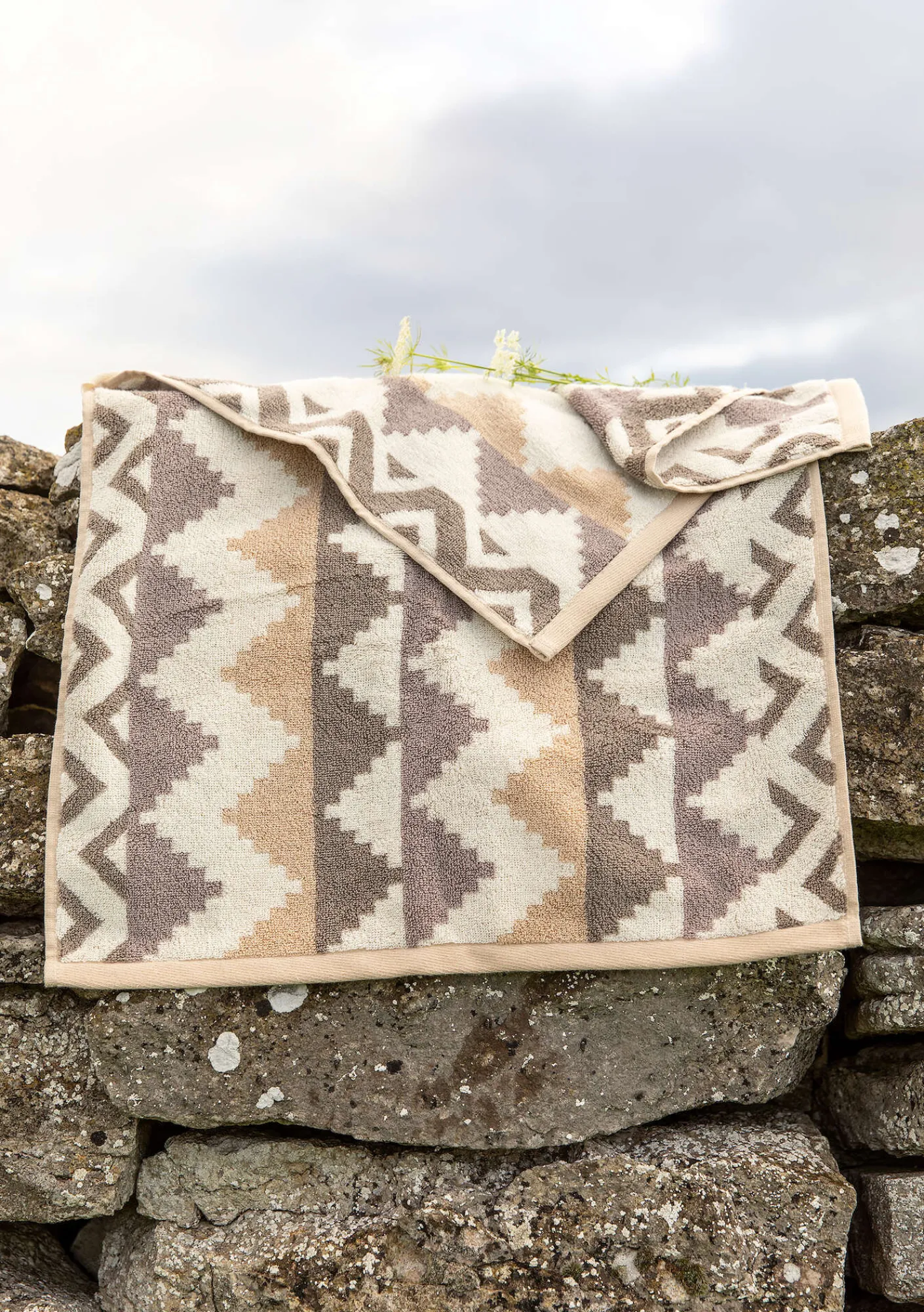 Handduk med grafiskt zick-zackmönster och bårder. Kontrastfärgad kant och hängare på kort- och långsidan.