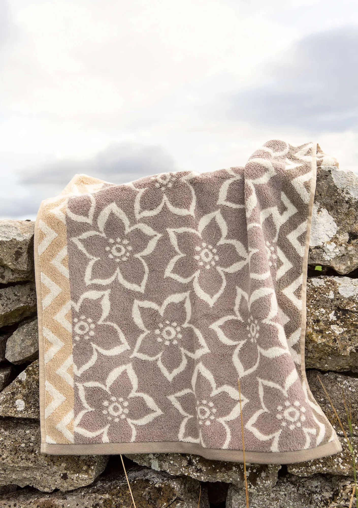 Handduk med blommönster och bårder. Kontrastfärgad kant och hängare på kort- och långsidan.