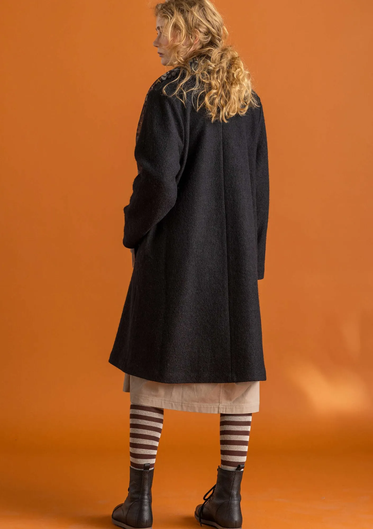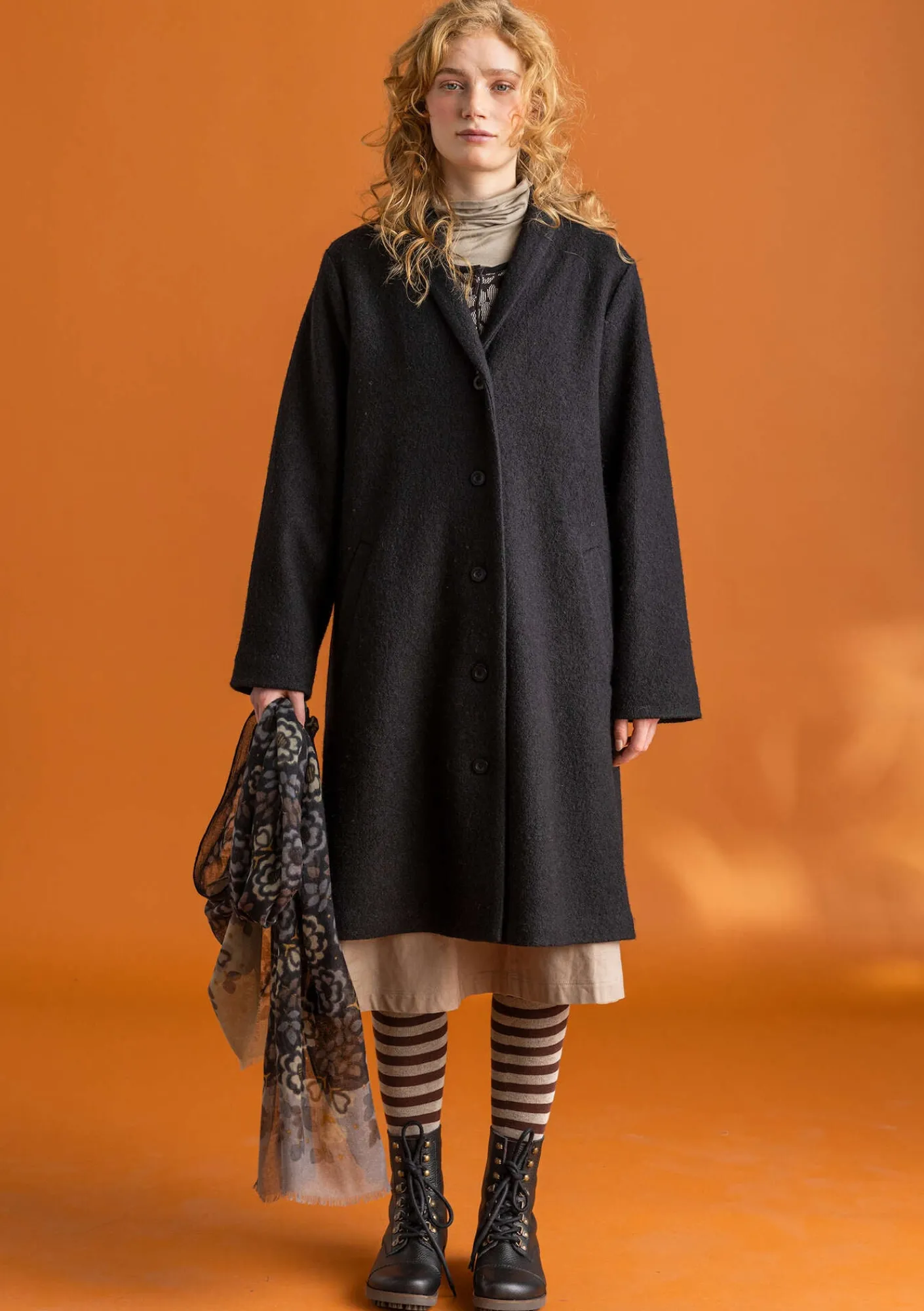 Halvfodrad kappa med nätt sjalkrage i ett bouclégarn som ger en fin ojämnhet som ger ytan liv. Enfärgad med praktiska fickor.