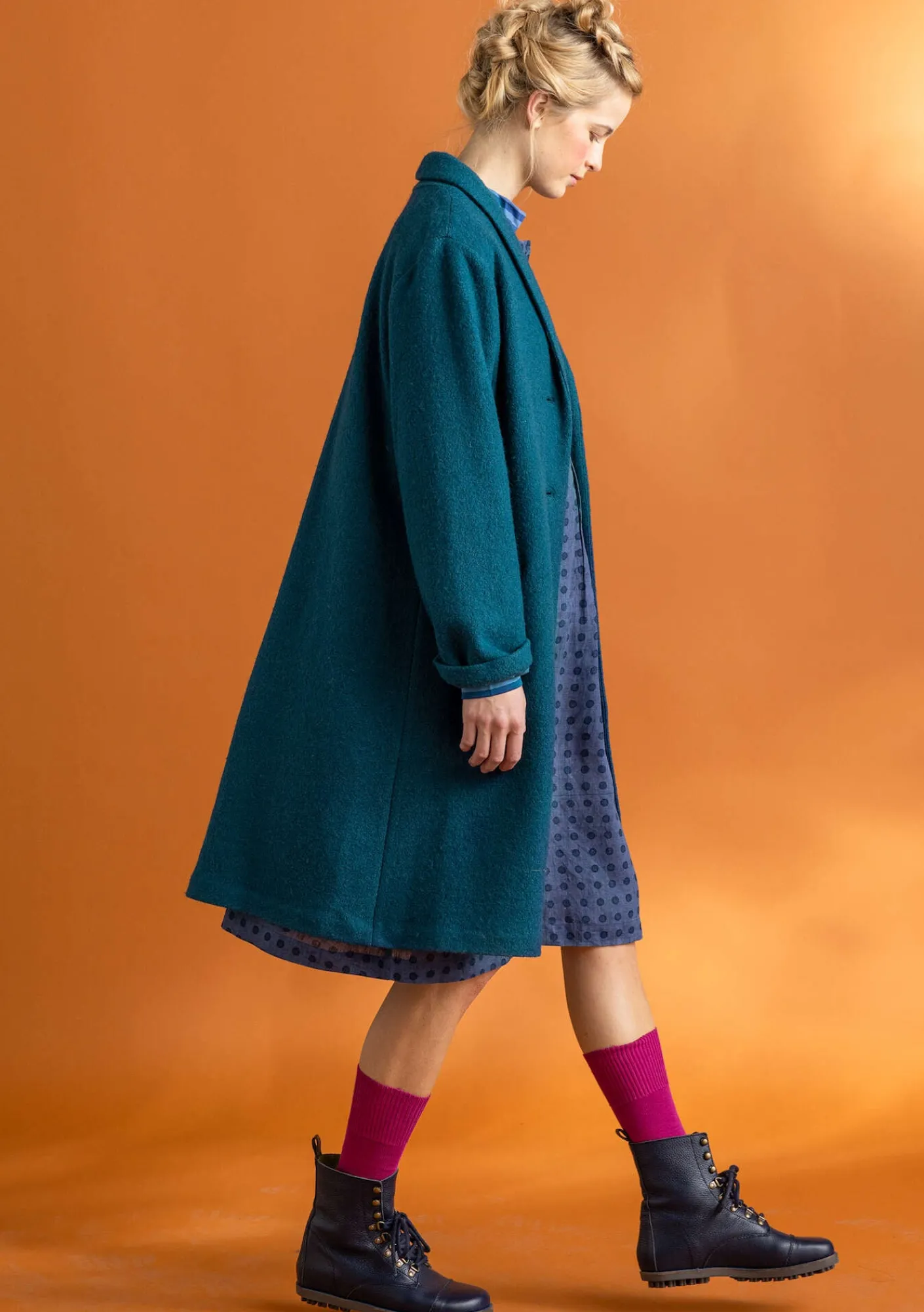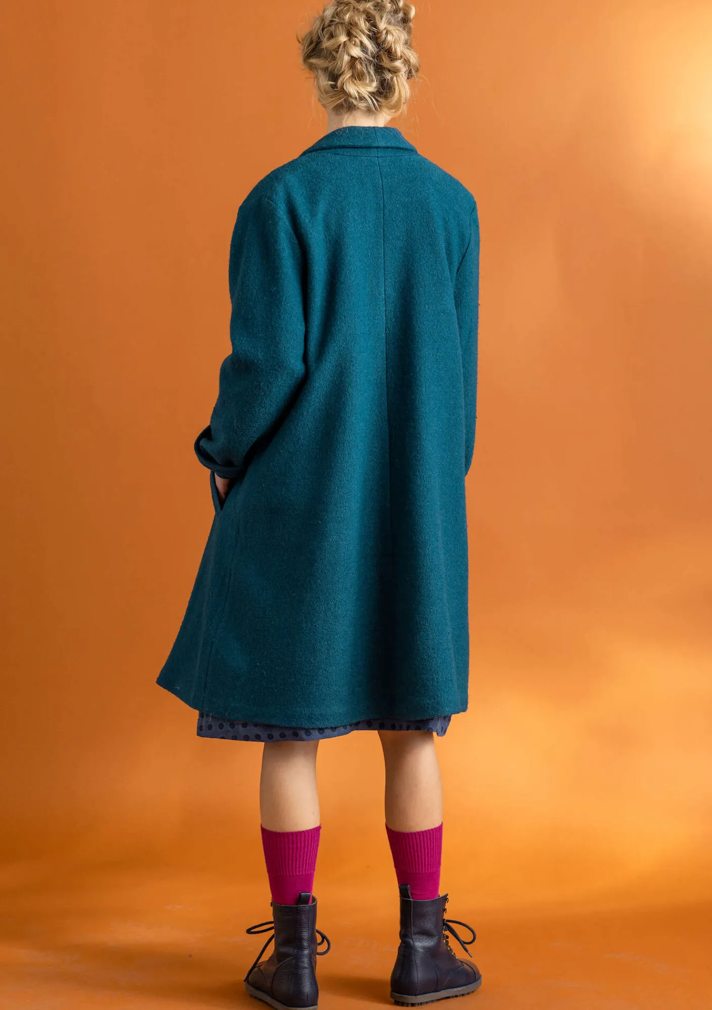 Halvfodrad kappa med nätt sjalkrage i ett bouclégarn som ger en fin ojämnhet som ger ytan liv. Enfärgad med praktiska fickor.
