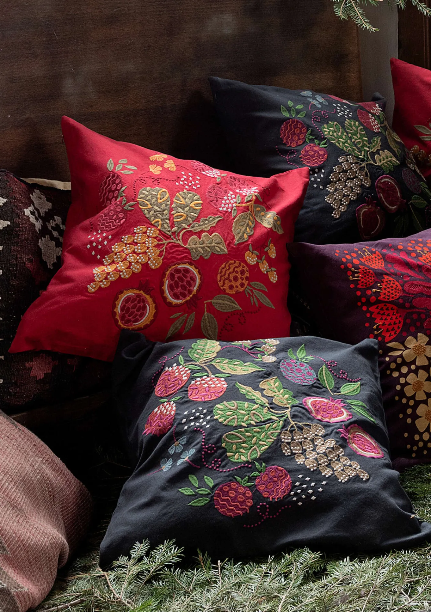Underbart kuddfodral med broderat motiv av kanderade frukter och frodiga blad. Stängs med dold dragkejda nedtill.