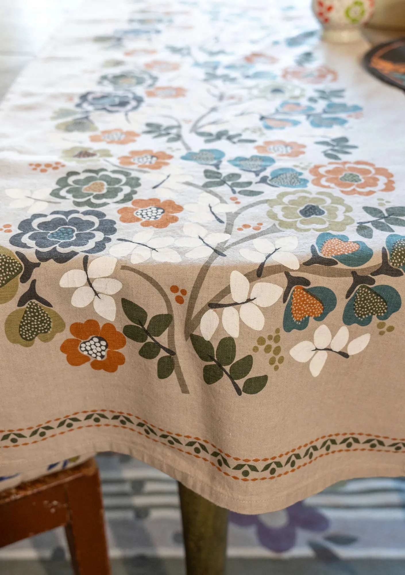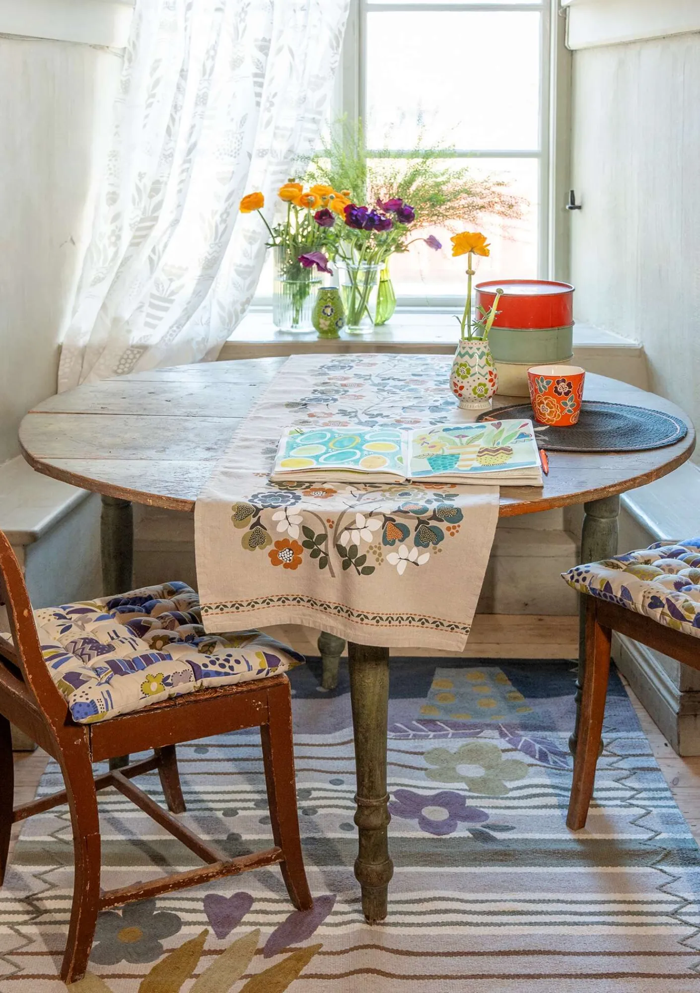 Vacker löpare med det placerade mönstret ”Wild rose” och dekorativa bårder på kortsidorna, screentryckt på en väv i en mix av lin och ekologisk bomull.