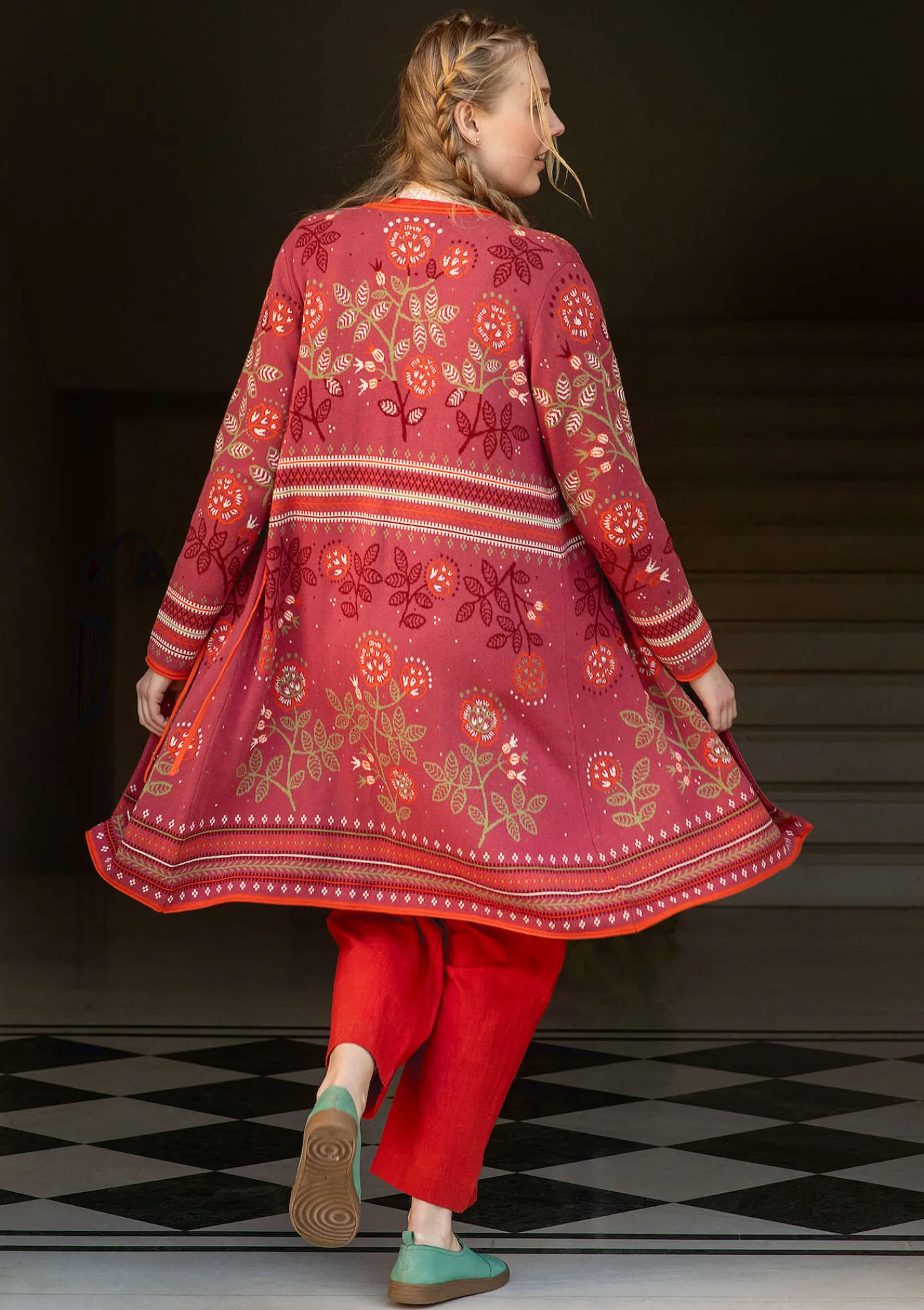 Jacquardstickad omlottkofta med motiv av vackra rosor och bårder. Modell med rullkanter, stickade knytband och hellång ärm.