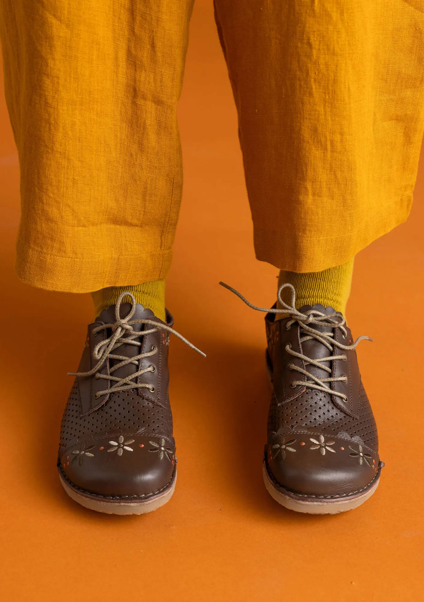 Söt promenadsko med broderade blommor och vågigt skurna kanter. Foträt modell med perforerat hålmönster samt halvfodrad.