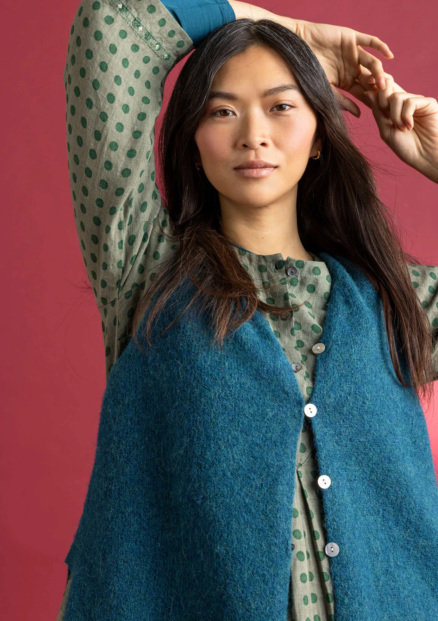 En stickad väst i längre modell. Gjord i vårt mjuka och lite håriga melangegarn. Pärlemorknappar med virkade öglor framtill och slits i sidorna.