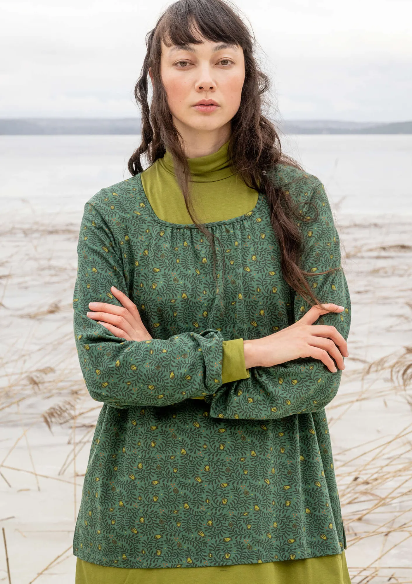Tryckt, småmönstrad trikåblus i en något utställd modell. Hellång ärm som har en liten puff i nedtill. Mjukt formad fyrkantsringning i halsen med rynkning framtill.