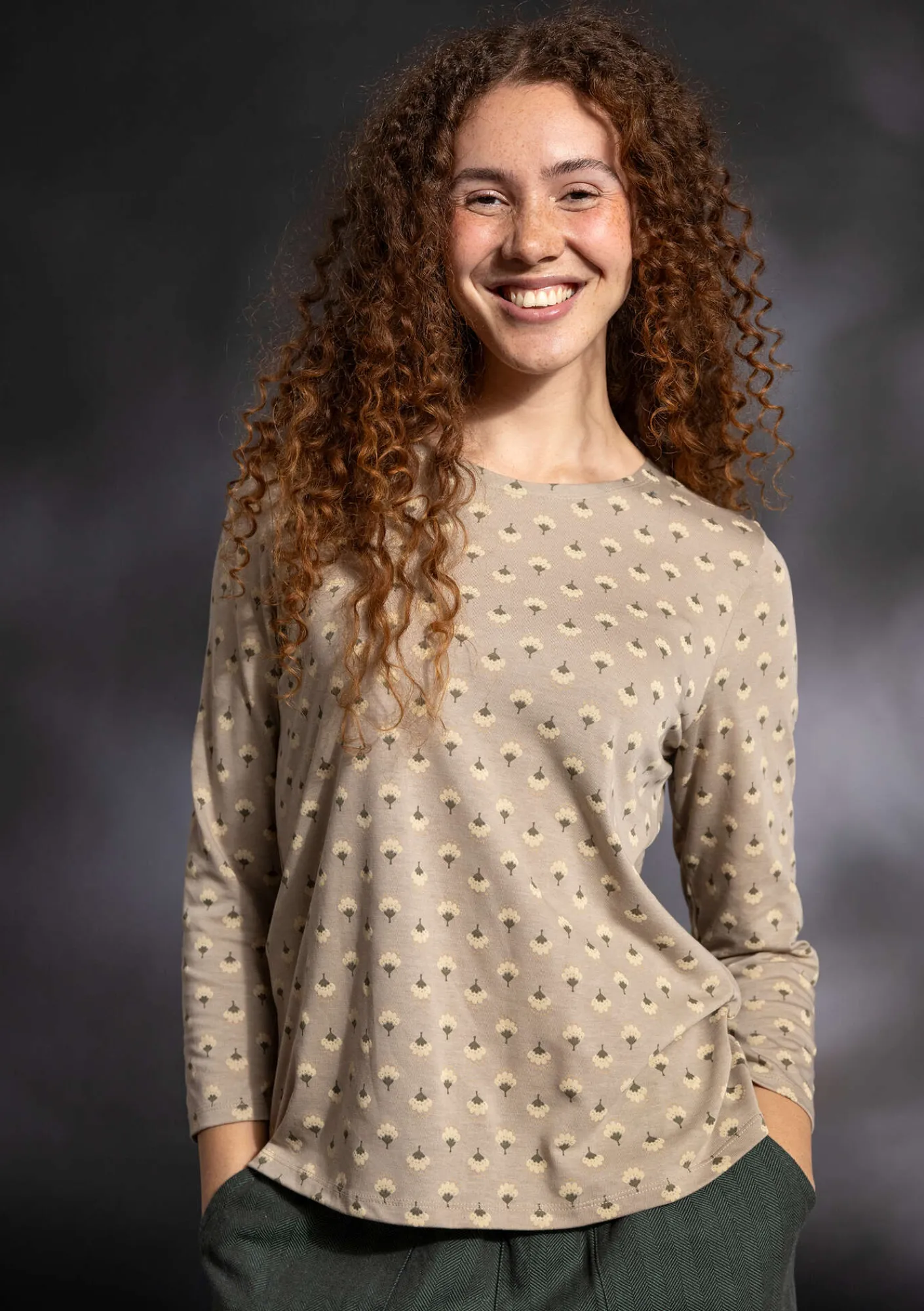 Trikåtop med tryckt mönster. Modell med trekvartslång ärm och rund halsringning. Sydd av resttyg.