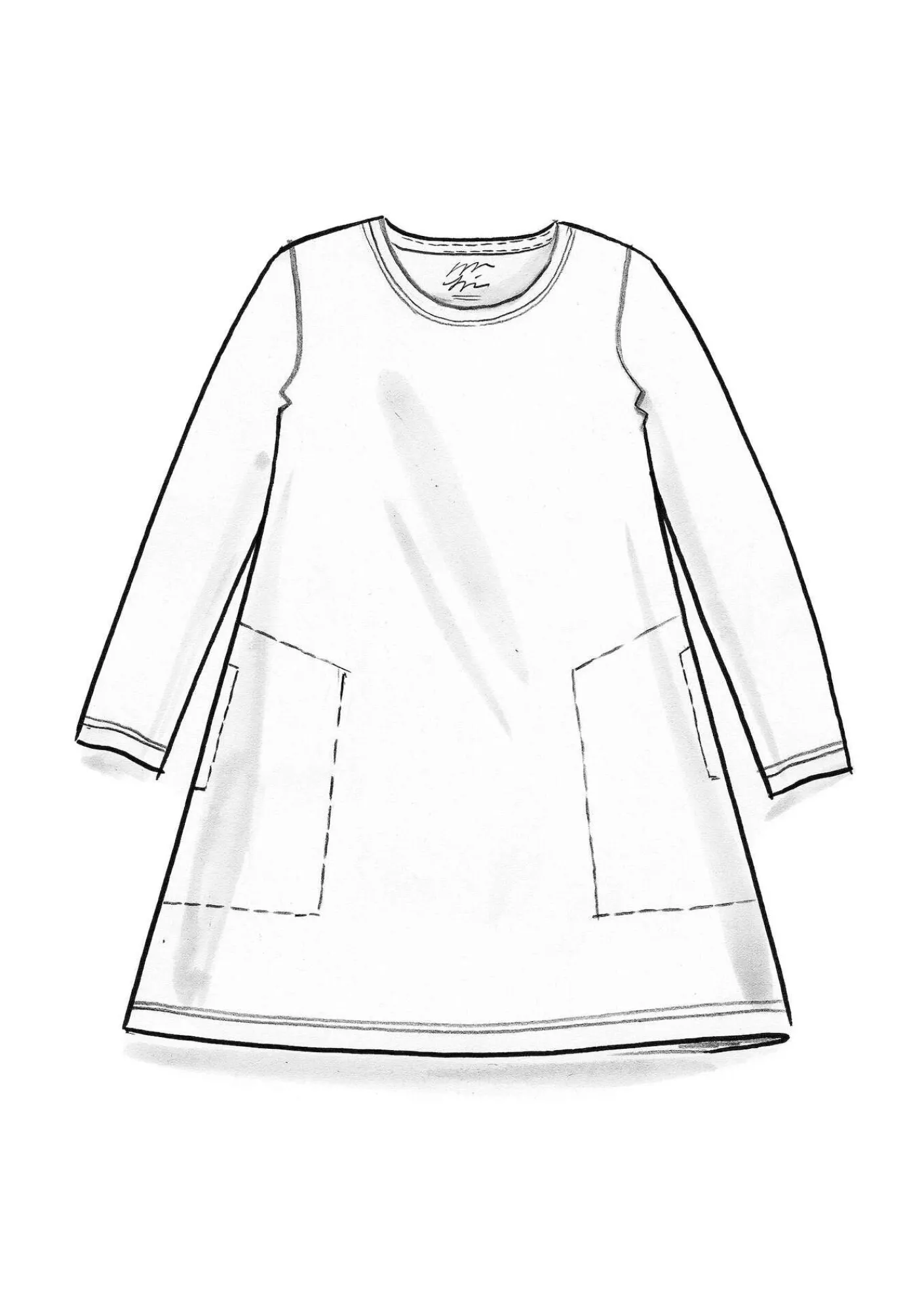 Enkel modell med rund halsringning och sidfickor. Hellång ärm. Finns både som enfärgad och med den tryckta pricken ”Tyra”. Lätt utställd i nederkant.