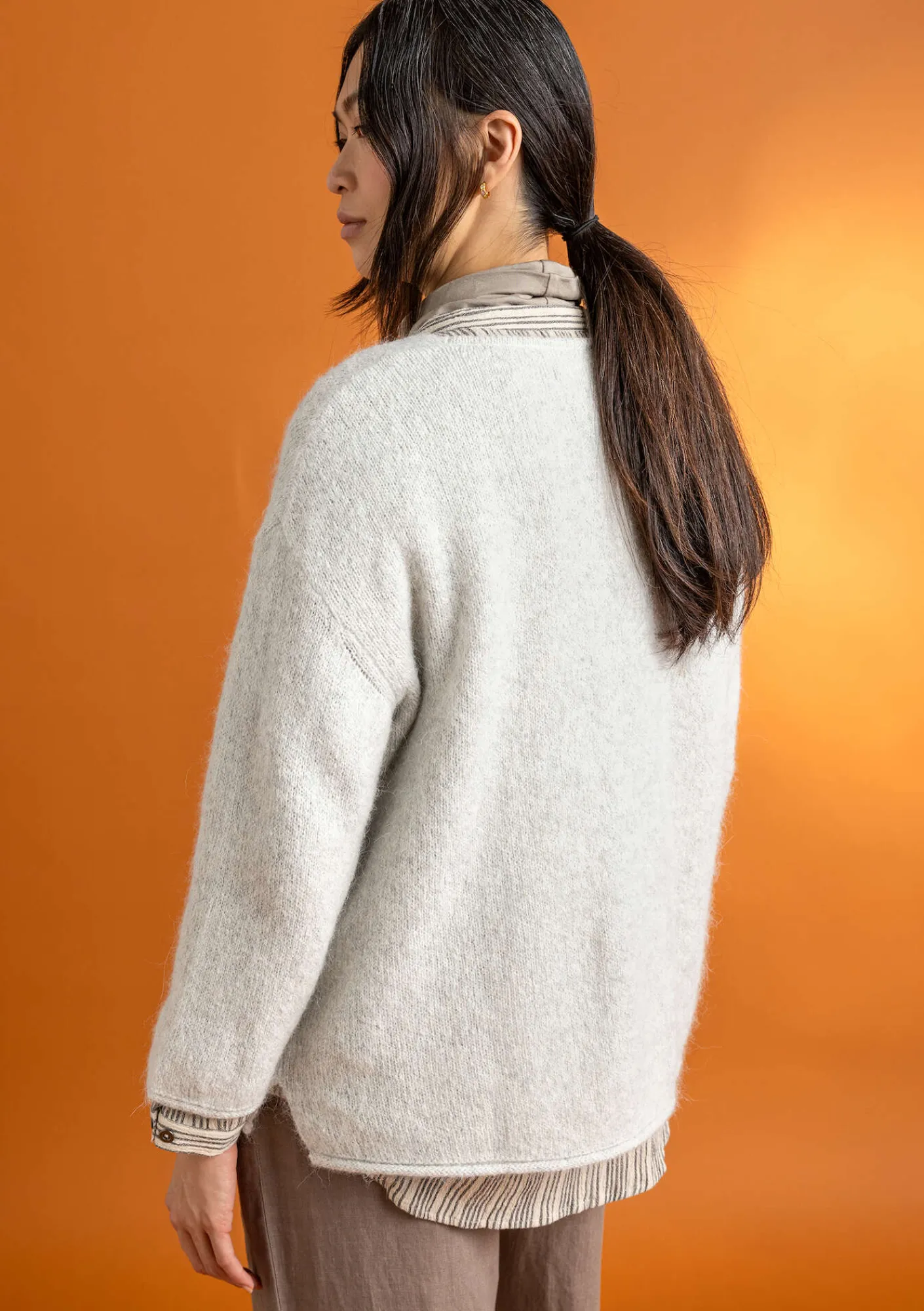 V-ringad tröja i en aningen lösare modell för mysiga dagar. Stickad i vårt fina melangegarn med små slitsar i sidorna. Ärmarna och nederkanten avslutas med en liten rullkant.