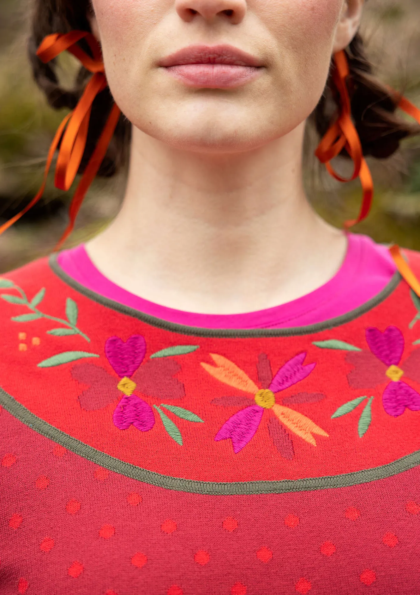 Dubbelsidigt jacquardstickad tröja med ett dekorativt broderi kring den runda halsringningen. En söt uddkant nedtill och vid ärmsluten.