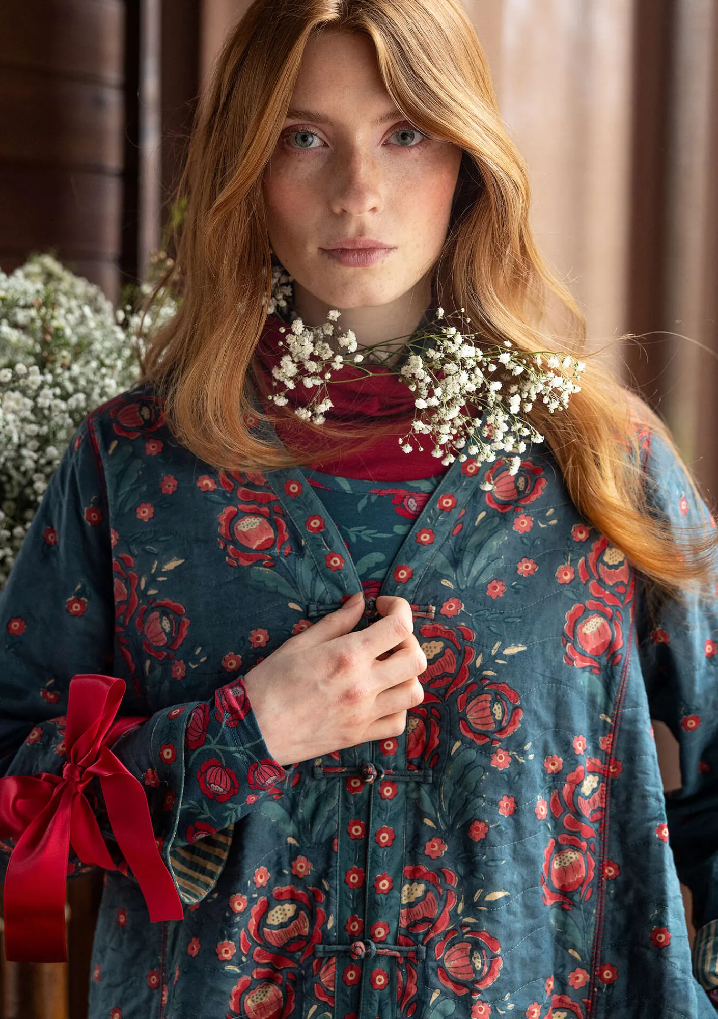 Blocktryckt jacka i en vändbar, rak modell med hellång ärm. Kviltad med ett tunt lager bomullsflanell. Sidfickor och en utanpåficka. Fint arbetad med en broderad blomma på ryggen. Knäpps med textila kinaknappar, i klassisk modell.