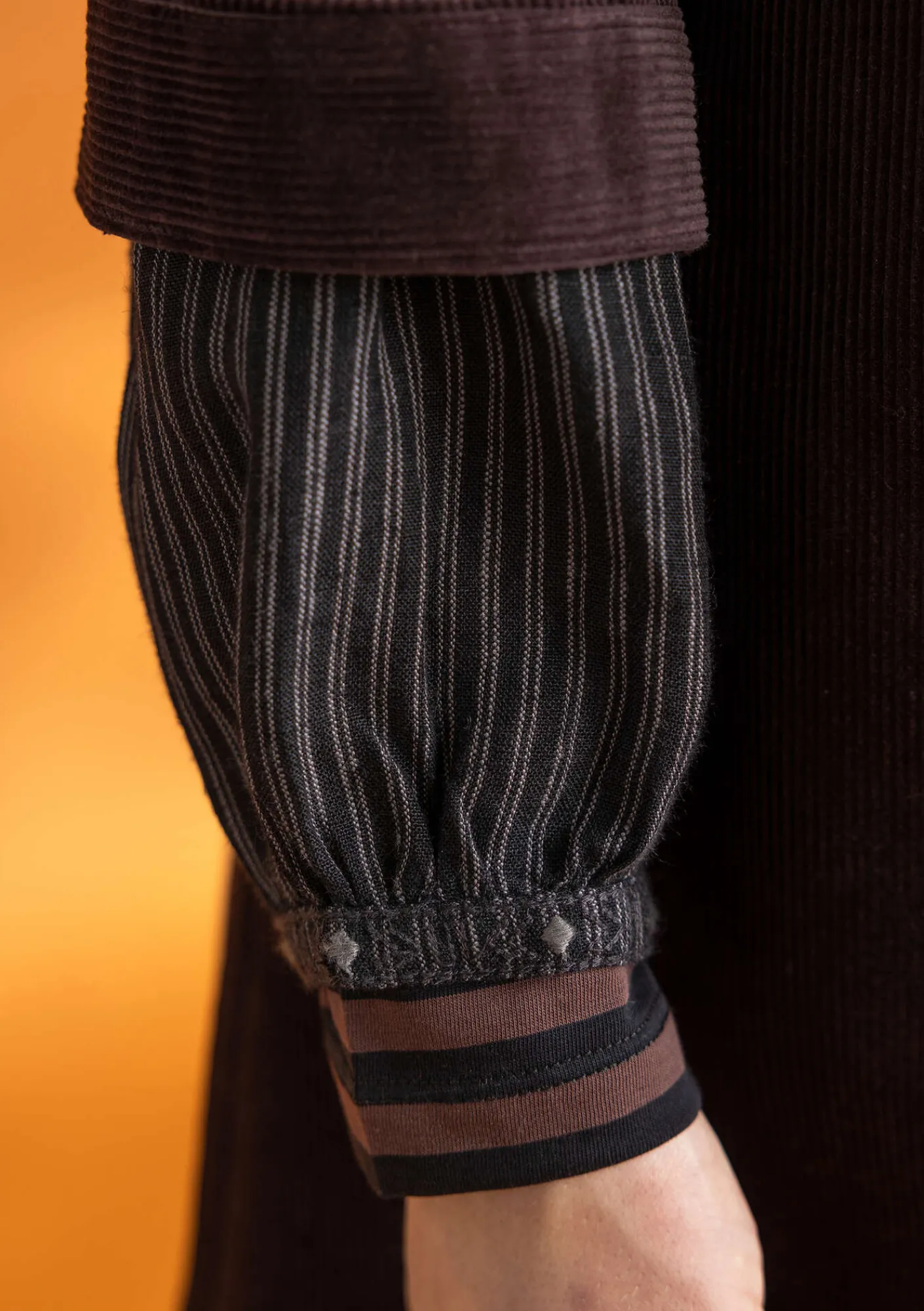 Genomknäppt blus, med utan-på-fickor. Finns som både i enfärgad och med en vävrand. Ok fram och bak. Hellång ärm med broderidetalj. Knäpps med pärlemorknappar och öglor. Slitsar i sidorna.